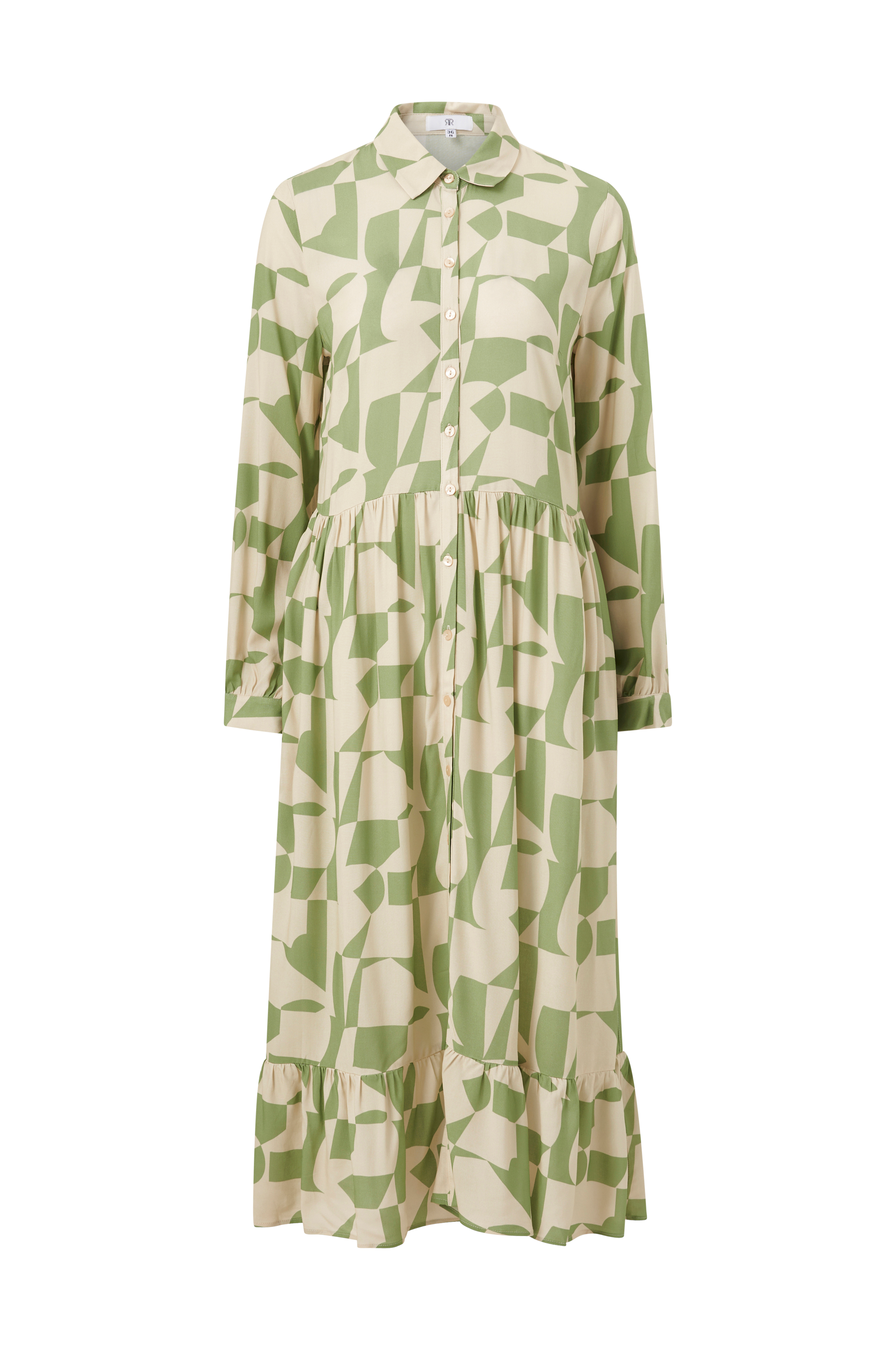 Skjortklänning som är lätt att matcha och passar året runt. Kvinnlig modell i mjukt tyg, med volang i nederkanten. Detaljer - Utställd modell - Midilängd - Hel knäppning - Lång ärm - Skjortkrage - Volang nedtill - Tryckt mönster Produktens mått i storlek 38/M - Längd: 125 cm - Ärmlängd: 62 cm