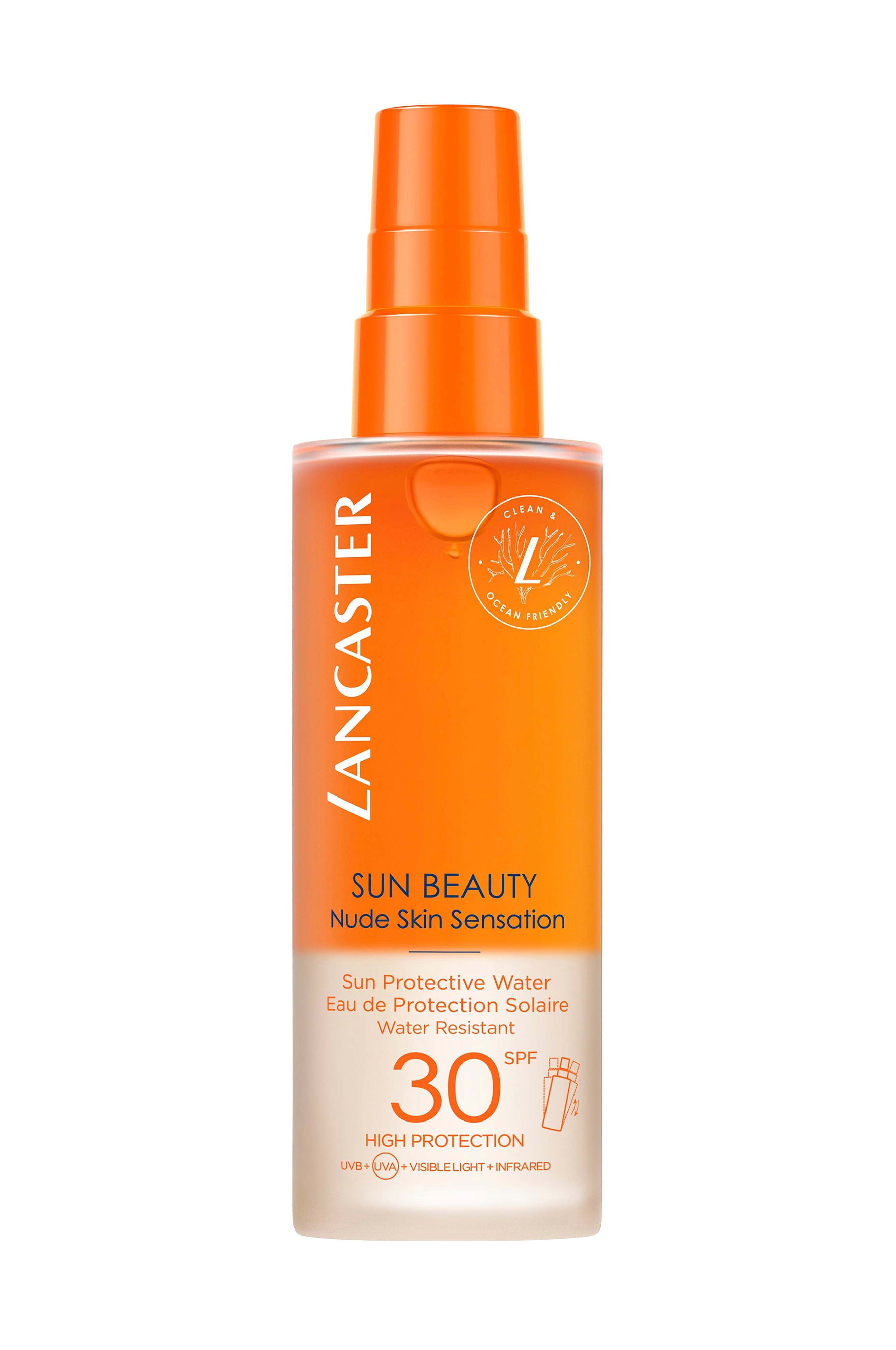 Tänk om du kunde få skydd mot solen utan att märka att du hade något på huden alls? Lancasters Sun Protective Water SPF 30 ger dig det bredaste solskyddet – täcker 100 % av solspektret* – och reparerar nu även befintliga solskador på huden. Denna otroligt lätta, uppfriskande och tunna konsistens är inte bara ren och miljövänlig, utan ger också huden en frisk, gyllene lyster dubbelt så snabbt som om du vistas i solen** – helt utan att märkas på huden.