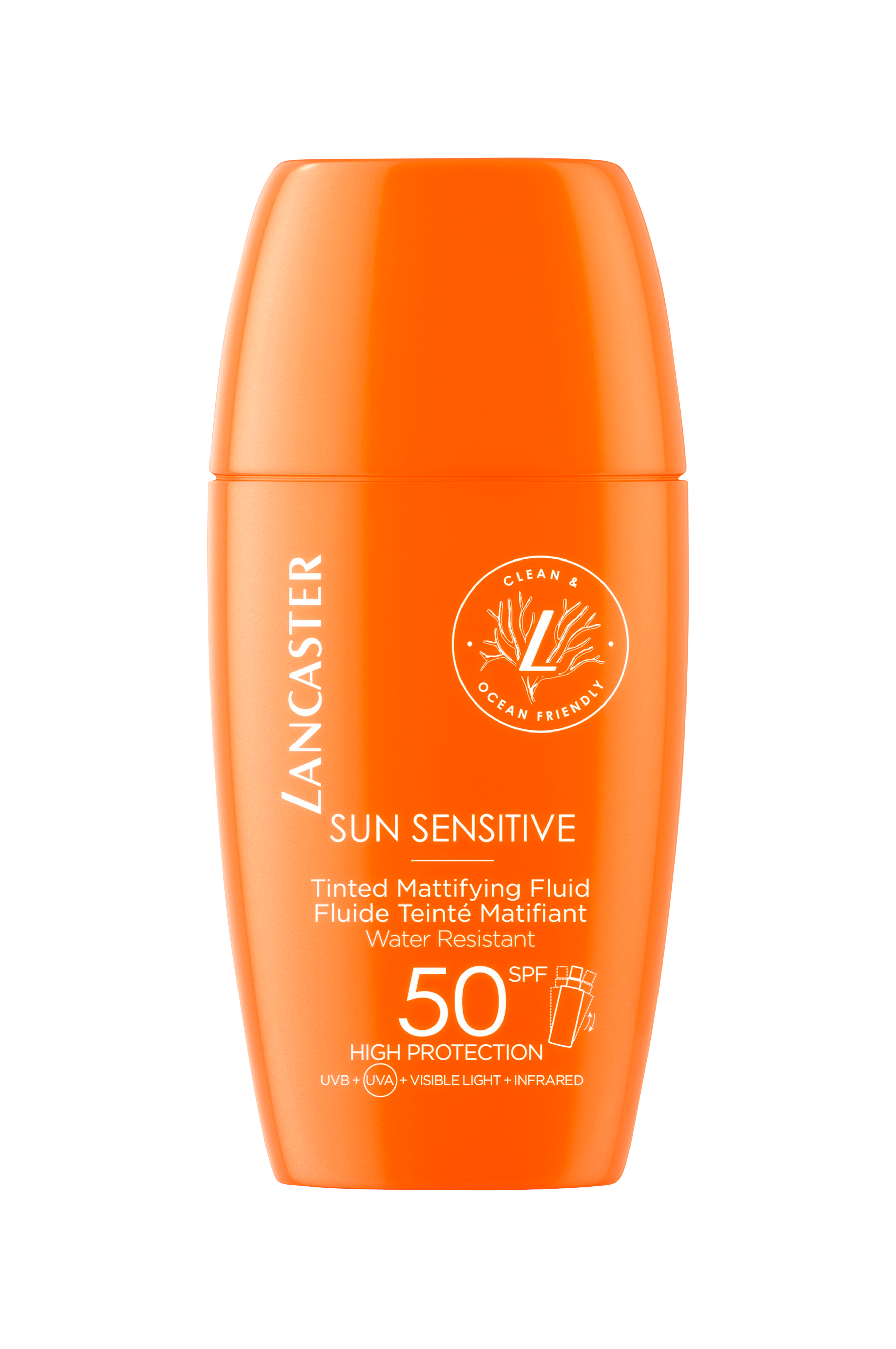 Lancasters solserie Sun Perfect är solskydd som fungerar som hudvård. Lancaster introducerar dess mest kompletta solskydd som även tar itu med rynkor och pigmentfläckar, samtidigt som det hjälper huden på traven att avslöja dess naturliga lyster. Sun Sensitive Tinted Mattifying Fluid SPF 50 är en färgad ansiktskräm och ett starkt solskydd i ett. Dess ickeklibbiga formula ger en kontrollerad lyster och anpassar sig till din hudton direkt och du får ett jämnt resultat. Särskilt anpassad för dig med en känslig hud.