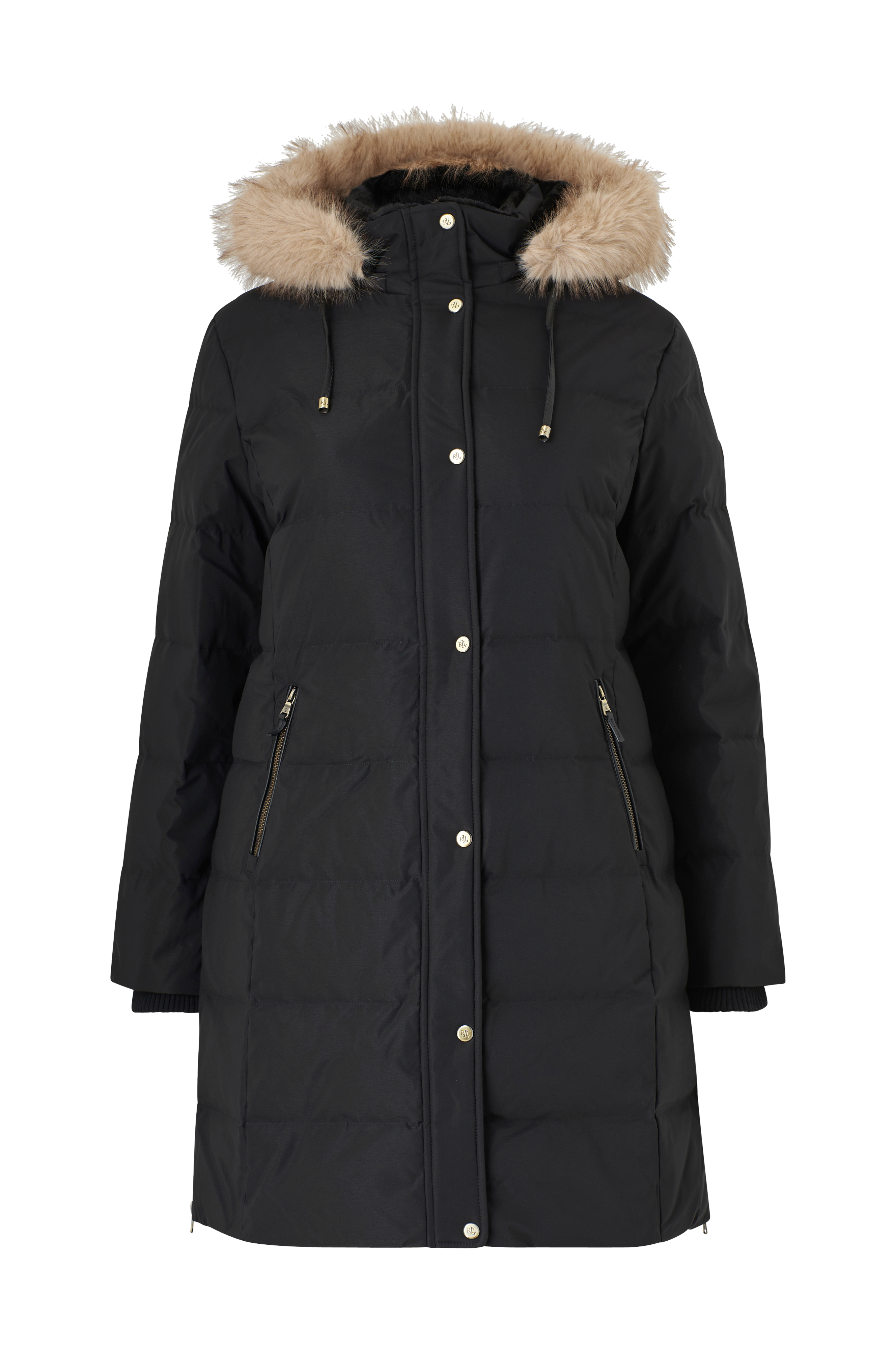 • Vadderad, quiltad dunkappa • Knäppning fram med dragkedja och knappar med en logga • Dragkedja i sidorna • Fluffig, avtagbar huva med dragsko och pälsfodrad kant • Fickor fram med dragkedja fram • Långa armar med ribbmudd i ärmsluten • Plusstorlek • Längd: 94 cm i storlek XL
