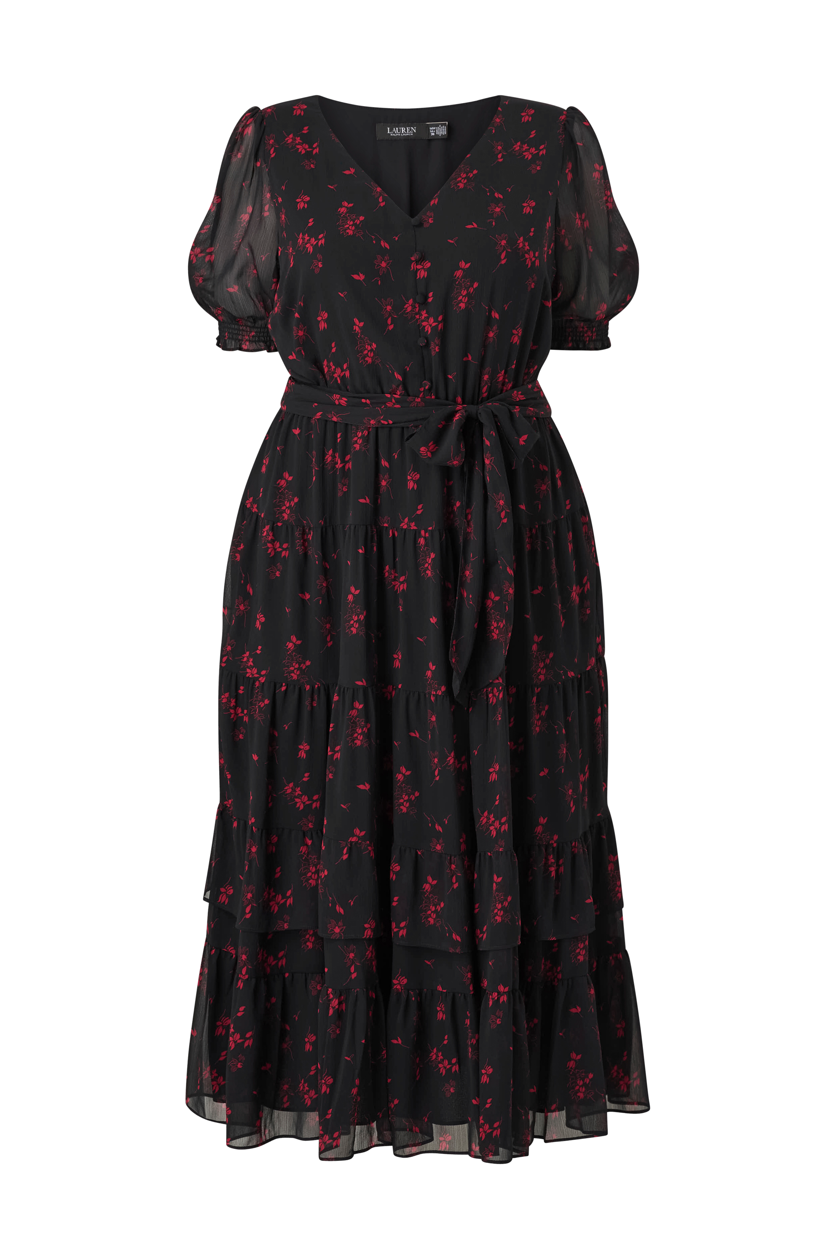 • Kortärmad, fodrad klänning i tunn viskos med ett blommönster • Korta, transparenta ballongärmar med smock i ärmsluten • V-formad halsringning • Insnitt vid bysten • Dekorativa knappar upptill fram • Resårmidja • Volanger på nederdelen • Knytband i midjan • Plusstorlek • Längd: 126 cm i storlek 14W