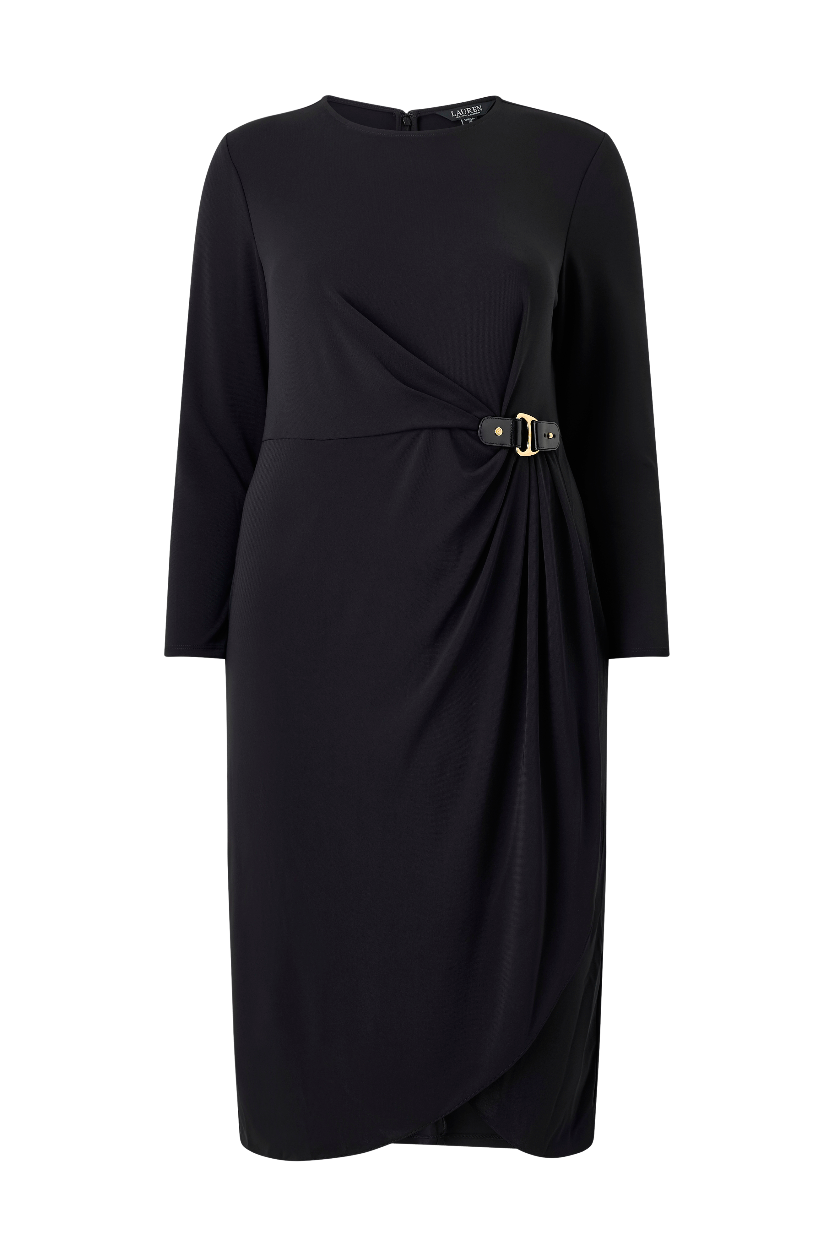 • Långärmad klänning med rund halsringning• Dragkedja i nacken• Guldfärgat, dekorativt spänne i midjan• Omlottdesign i midjan och nedtill• Plusstorlekar• Längd: 125 cm i storlek 14W