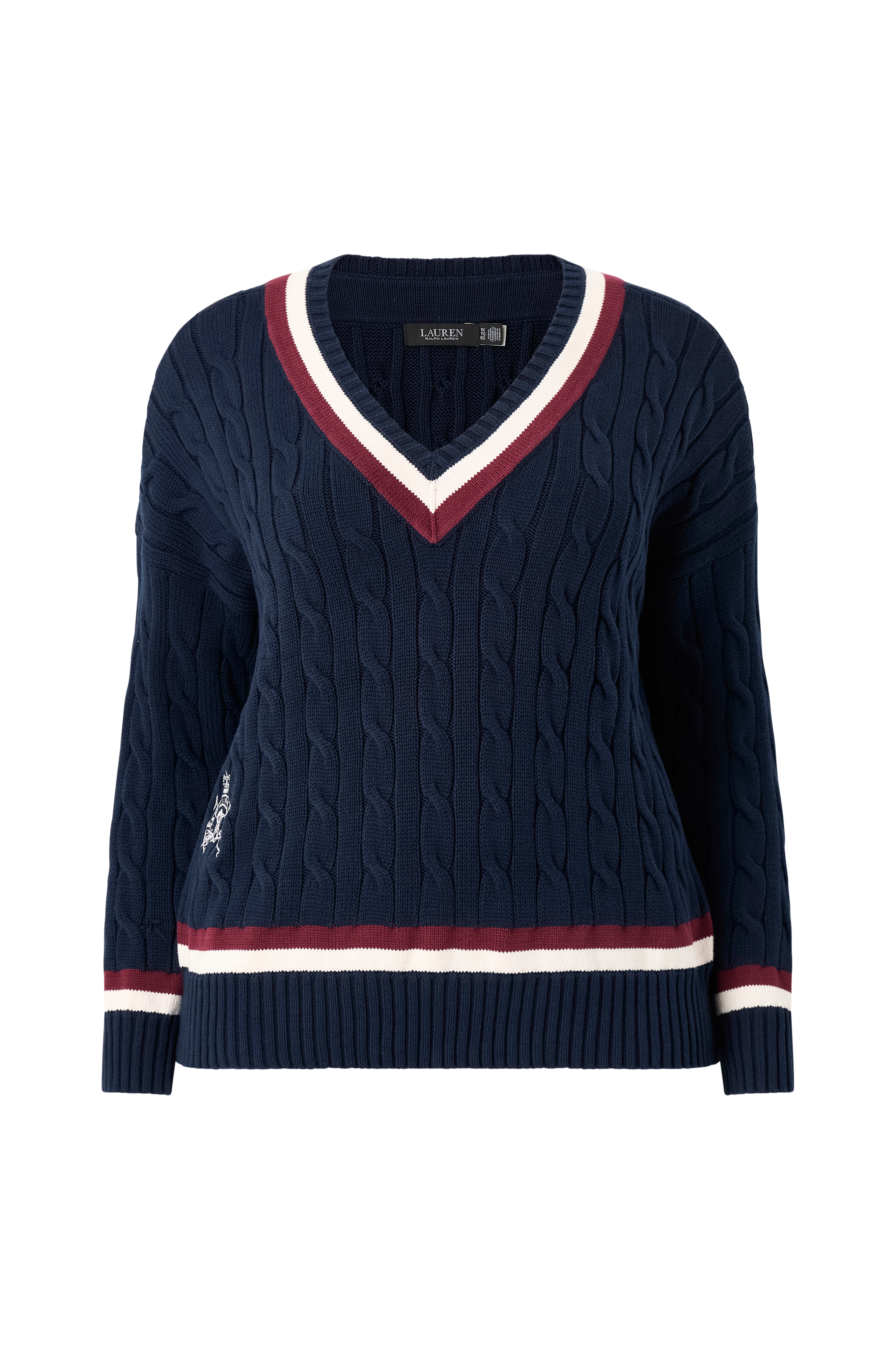 • Kabelstickad tröja• V-ringning• Långa ärmar• Logomärke nedtill• Ribbstickade detaljer• Plusstorlekar