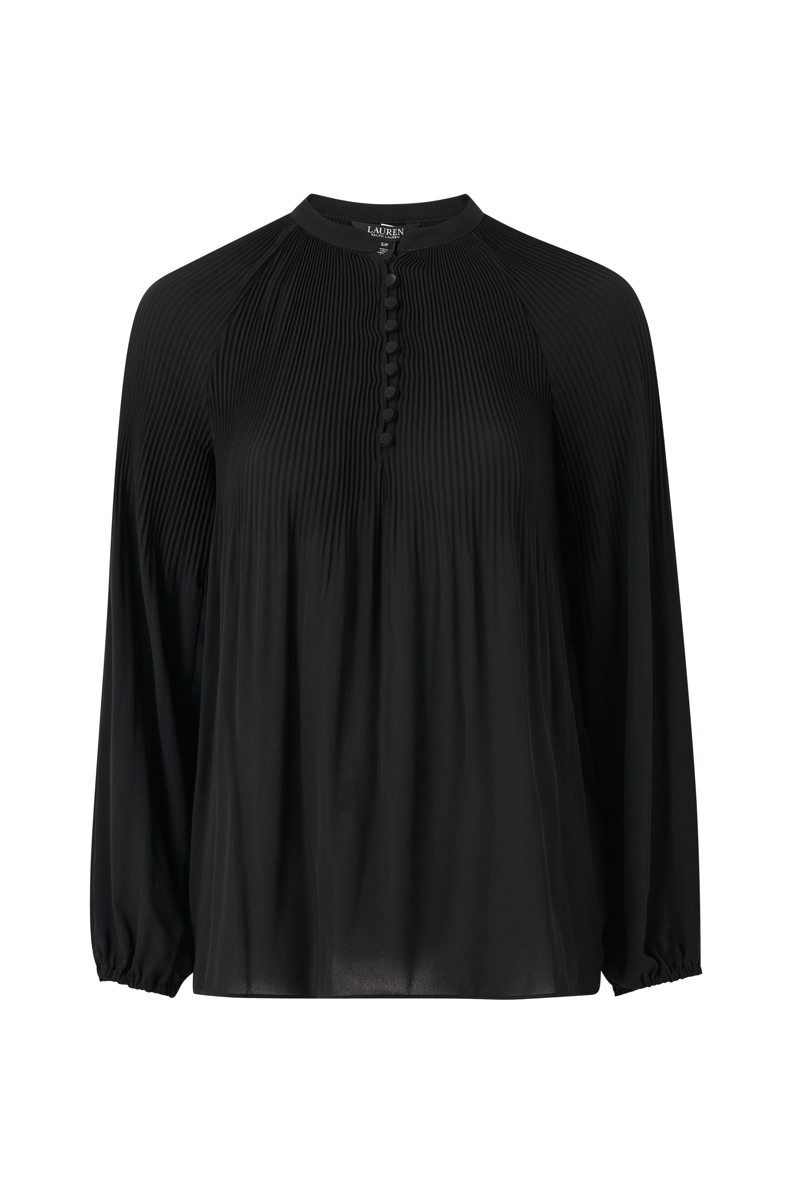 • Utsvängd, plisserad modell i chiffong • Rund hals • Ögleknäppning med klädda knappar på bröstet • Vid raglanärm med resårer i ärmsluten • Produkten innehåller återvunnet material som har tagits tillvara för att minska mängden avfall, samtidigt som nya resurser inte har förbrukats.