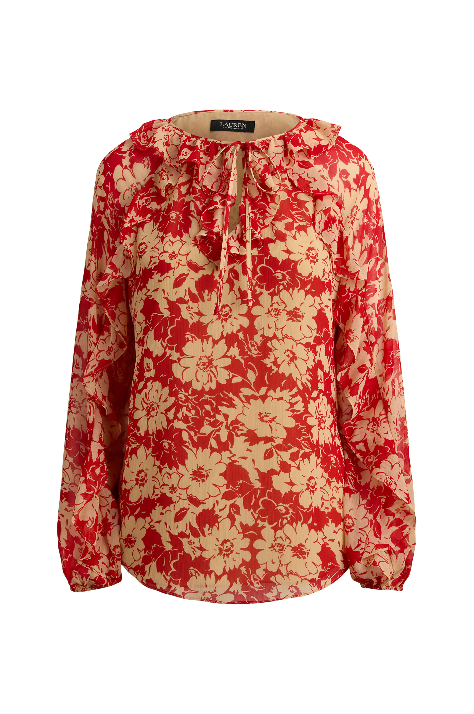• Blus i chiffong med dekorativa volanger• Rund halsringning• Sprund med knytband fram• Långa, transparenta ballongärmar• Textilfoder• Rundad nederkant