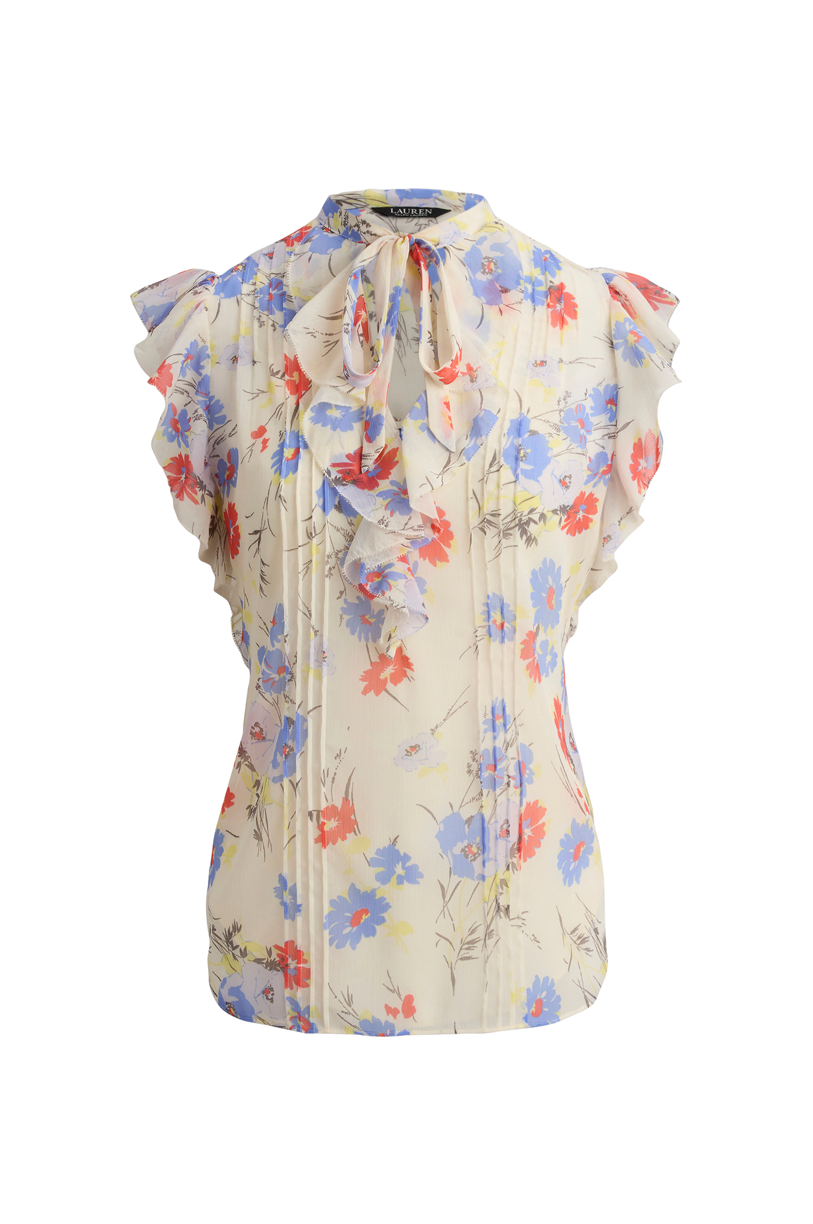 • Blus i chiffong• V-ringning med volangkant• Dekorativt knytband• Korta volangärmar• Uttagbart underlinne• Rundad nederkant
