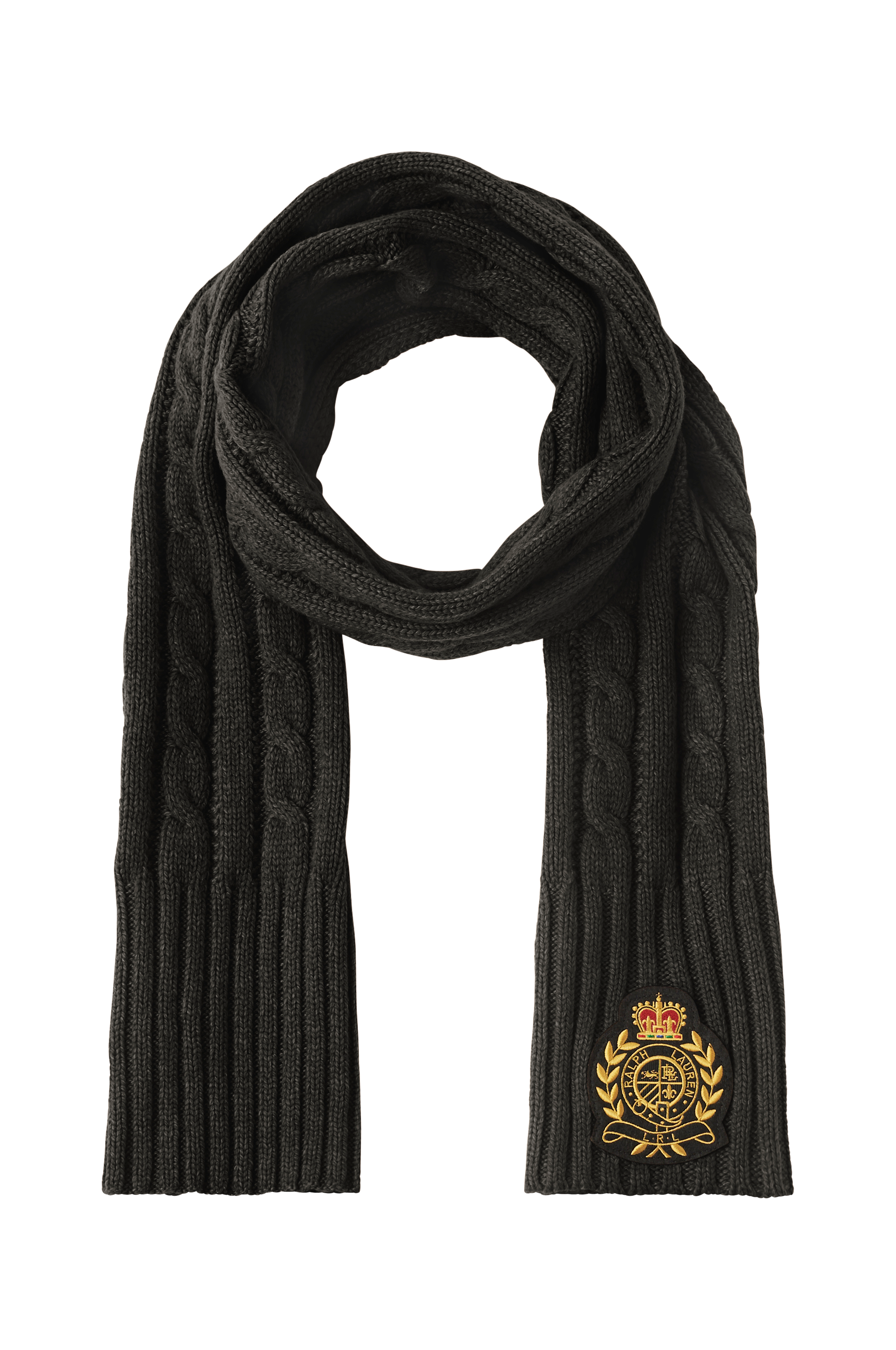 • Kabelstickad halsduk• Påsytt, broderat emblem på kortsidan• Mått: 22x186 cm