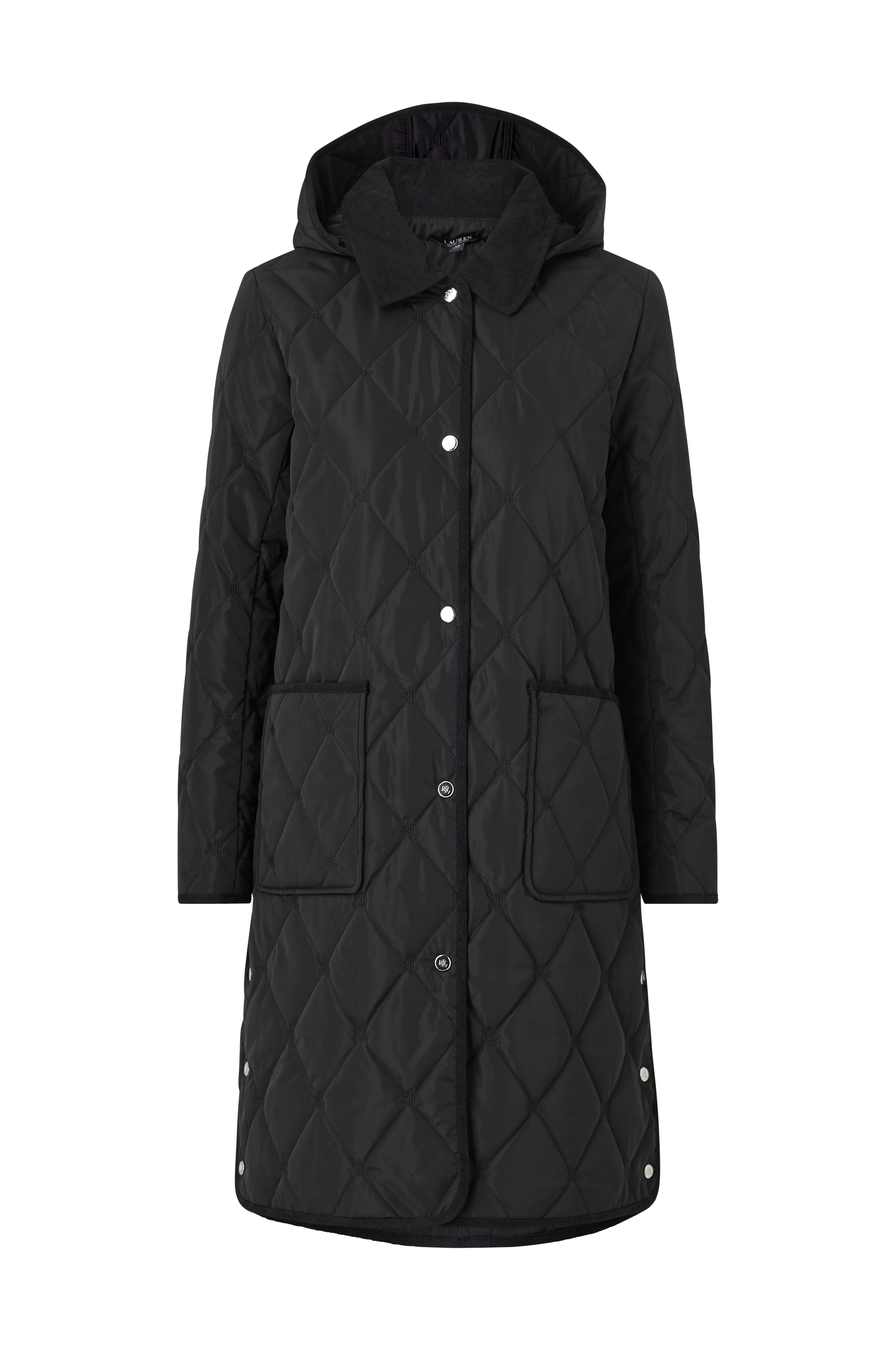 • Quiltad, lätt vadderad kappa• Avtagbar huva• Krage med ribbad insida• Tryckknappsstängning• Två fickor• Tryckknappar nedtill i sidorna• Längd: 100 cm i storlek S