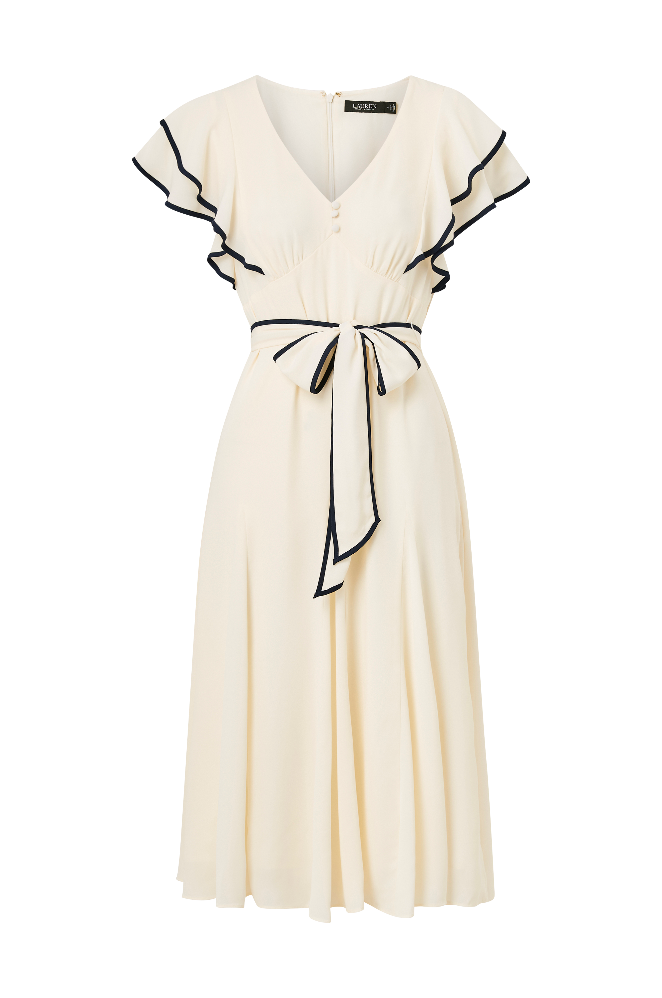 • Utsvängd modell med böljande kjol • V-ringning • Korta volangärmar • Dold dragkedja i ryggen • Knytskärp i midjan • Fodrad • Längd: 116 cm i storlek 36 • Produkten innehåller återvunnet material som har tagits tillvara för att minska mängden avfall, samtidigt som nya resurser inte har förbrukats.