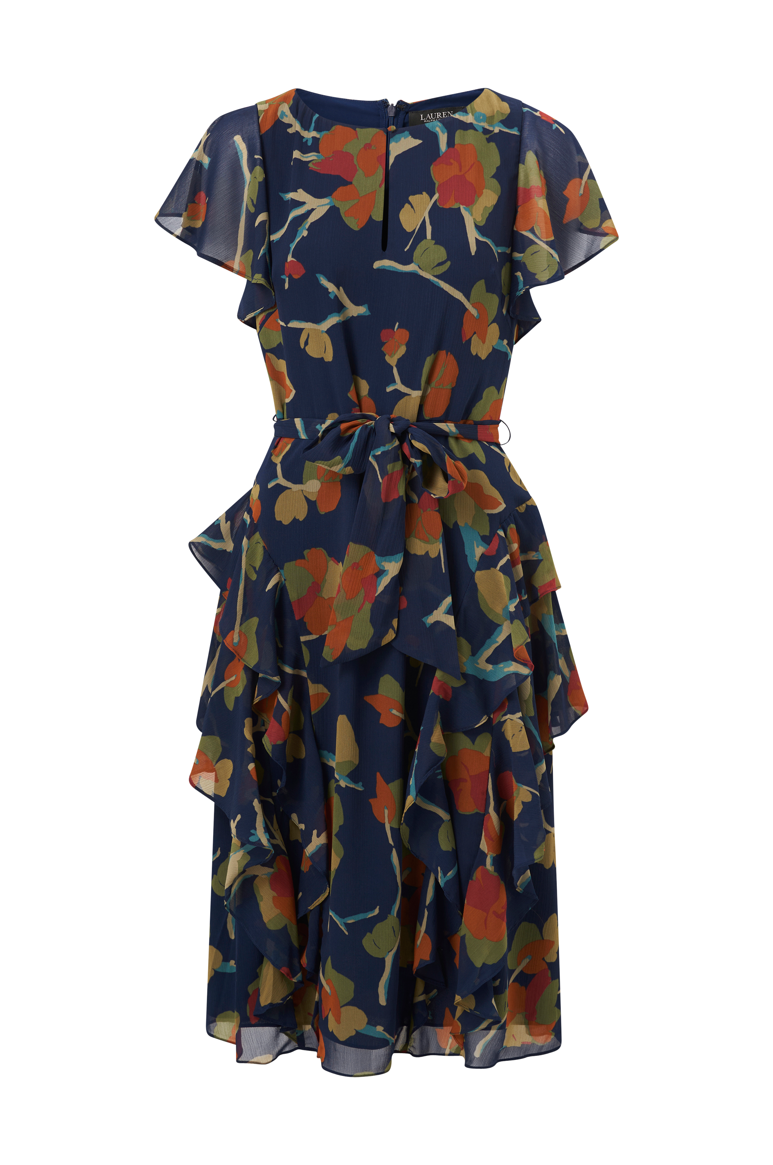 • Klänning i chiffong• Korta volangärmar• Knytskärp i midjan• Volanger på kjolen• Sprund med knapp i halsen• Dold dragkedja i ryggen• Fodrad• Längd: 113 cm i storlek 36