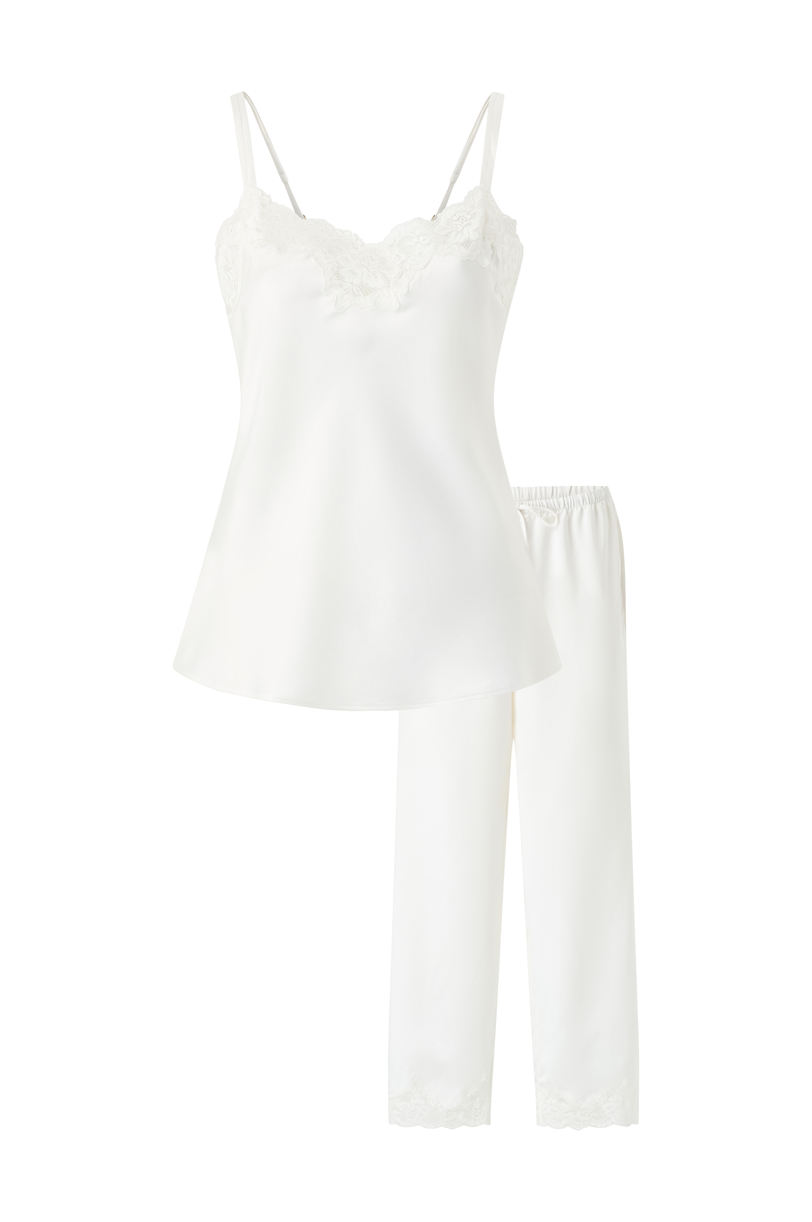 • 2-delat loungeset i satin• Linne med spets och justerbara axelband• Byxor med dragsko i midjan