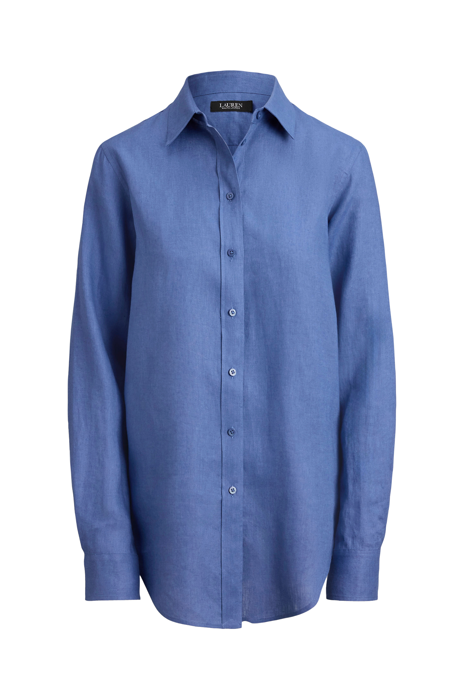 Skjorta i linnekvalitet med liten krage och dekorstickad knappslå fram. Lång ärm med manschett i ärmslut och invändig knäpptamp för uppvik.