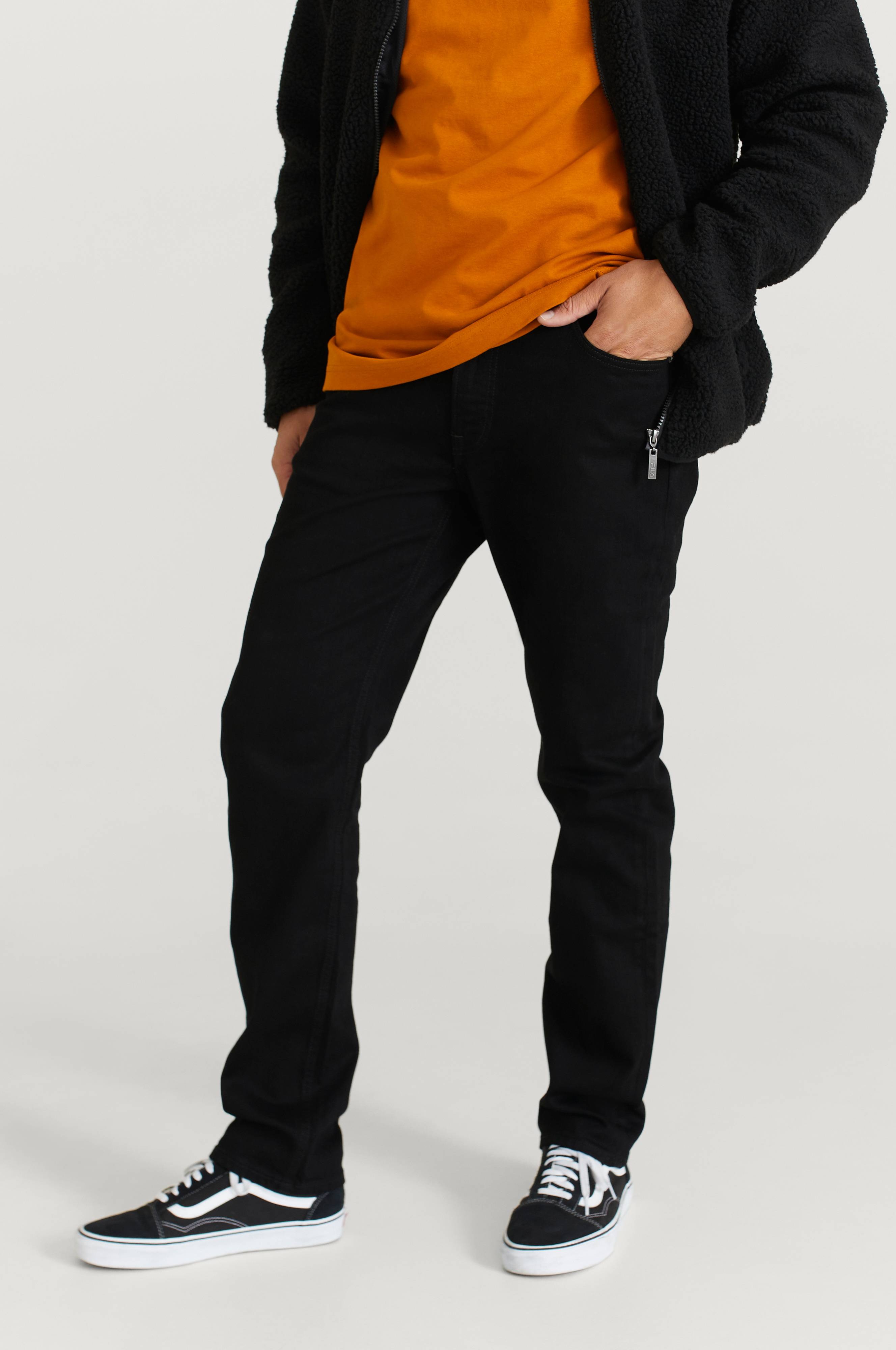 Jeans i stretchdenim. Femficksmodell med avslappnad, lös passform. Gylf med dragkedja.