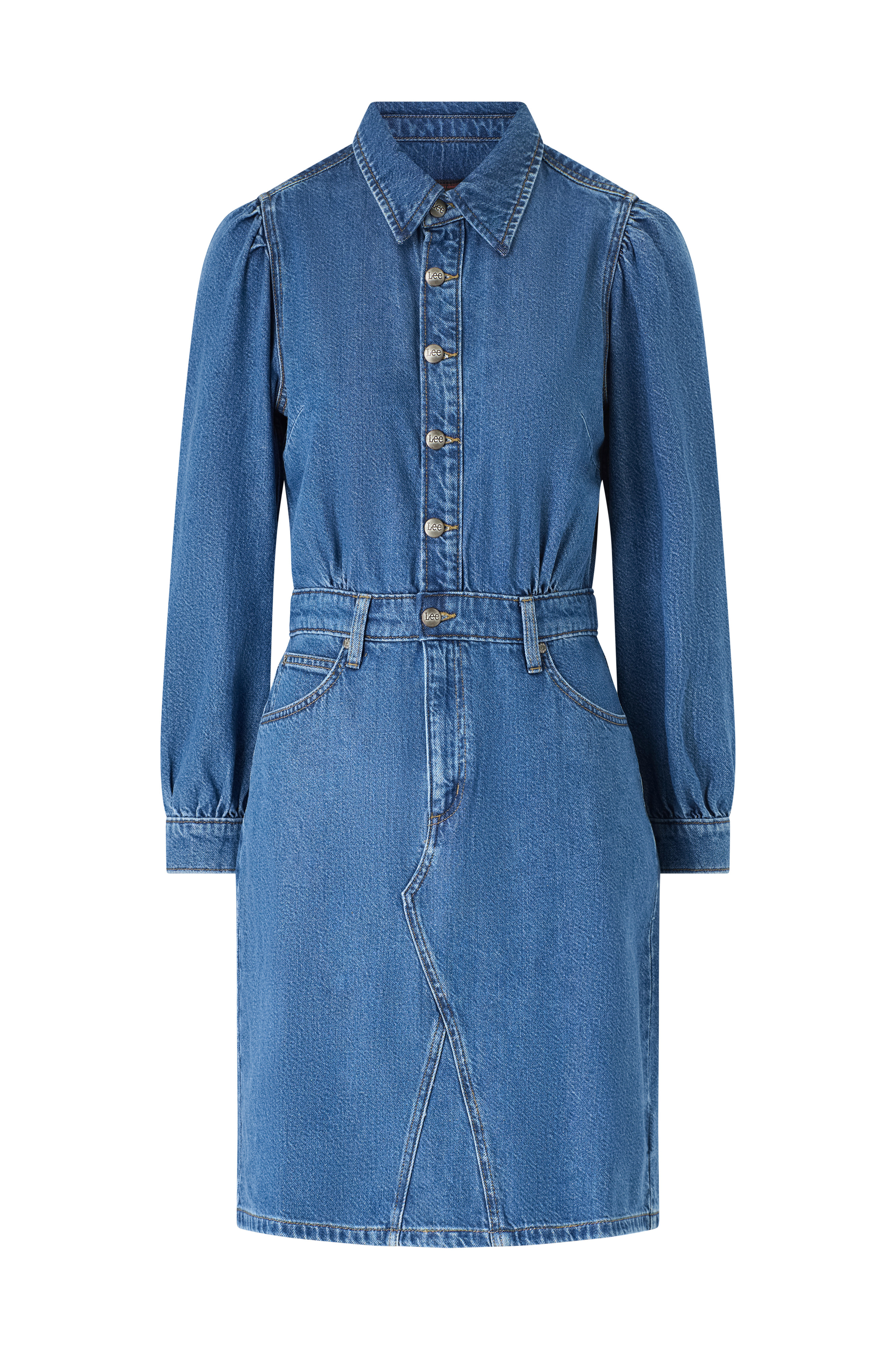 • Klänning i denim med krage och knappar upptill fram• Långa puffärmar med manschetter• Bälteshällor i midjan• Femficksmodell• Dragkedjegylf• Slits nedtill bak• Längd: 99 cm i storlek S