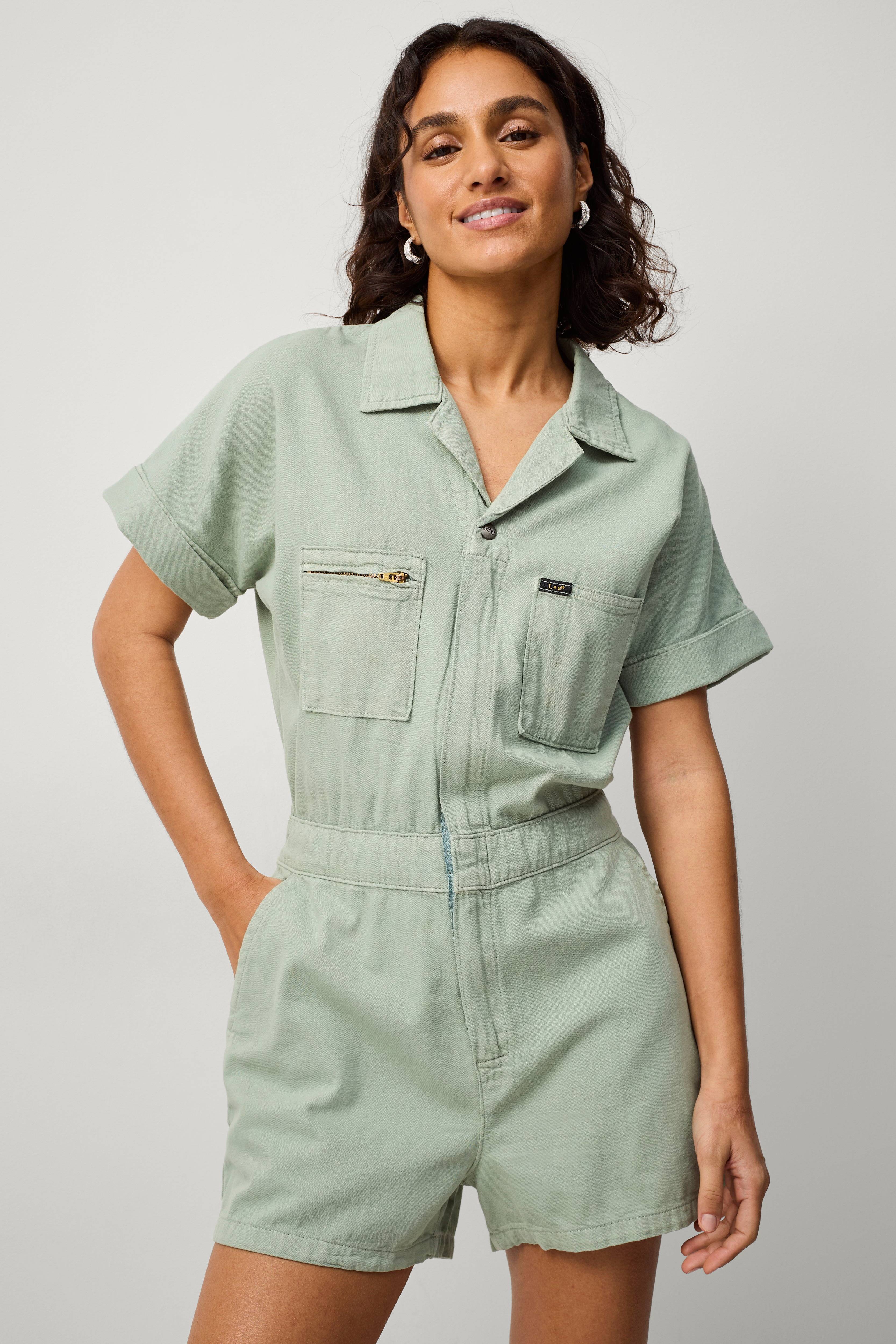 • Jumpsuit i bomullstwill• Korta ärmar med uppvik• Korta ben• Dragkedja fram• Sidfickor• Bröstfickor• Resår bak i midjan