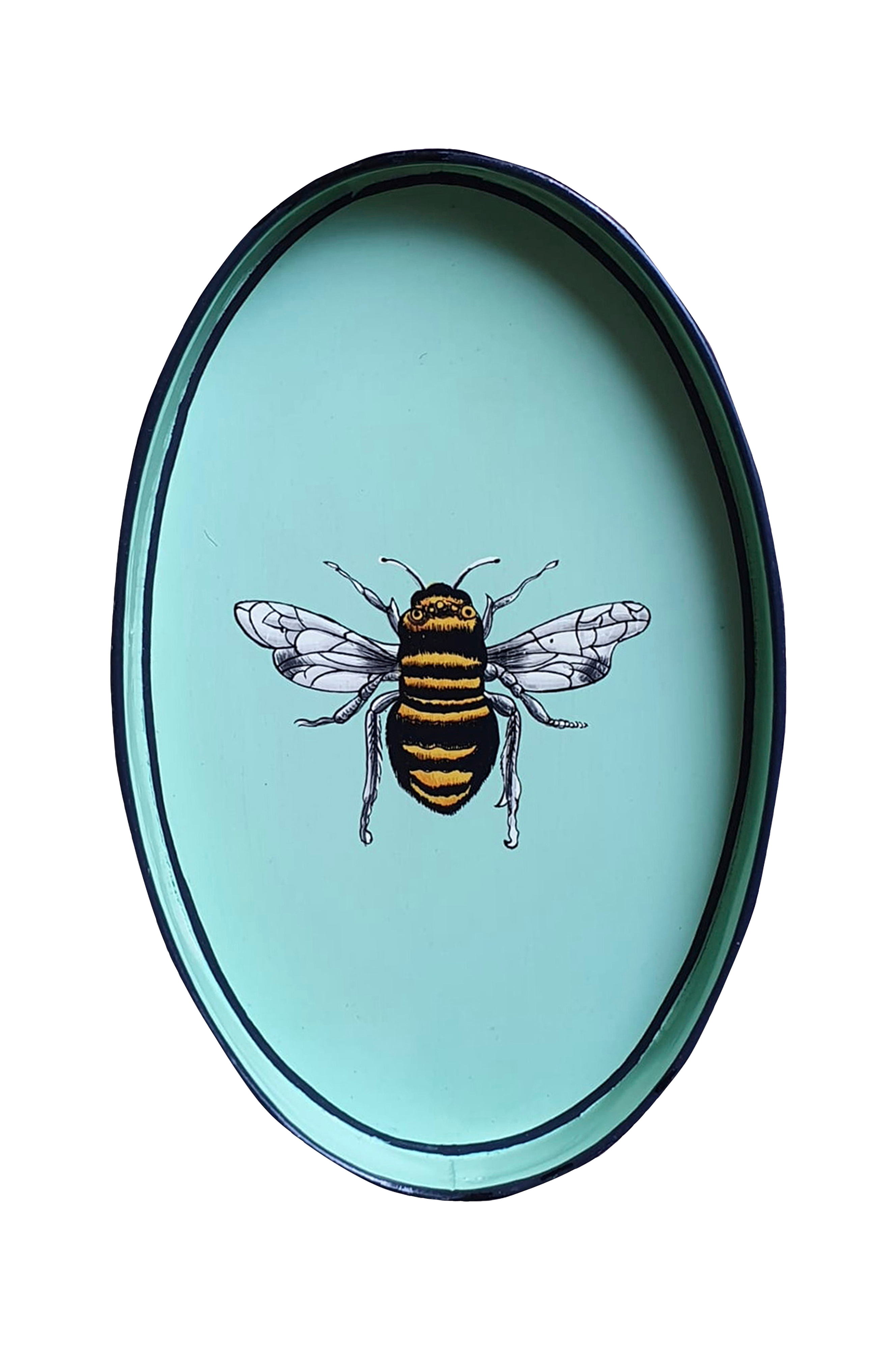 Handmålad bricka av järn med klara färger. Mått: 33x20 cm.