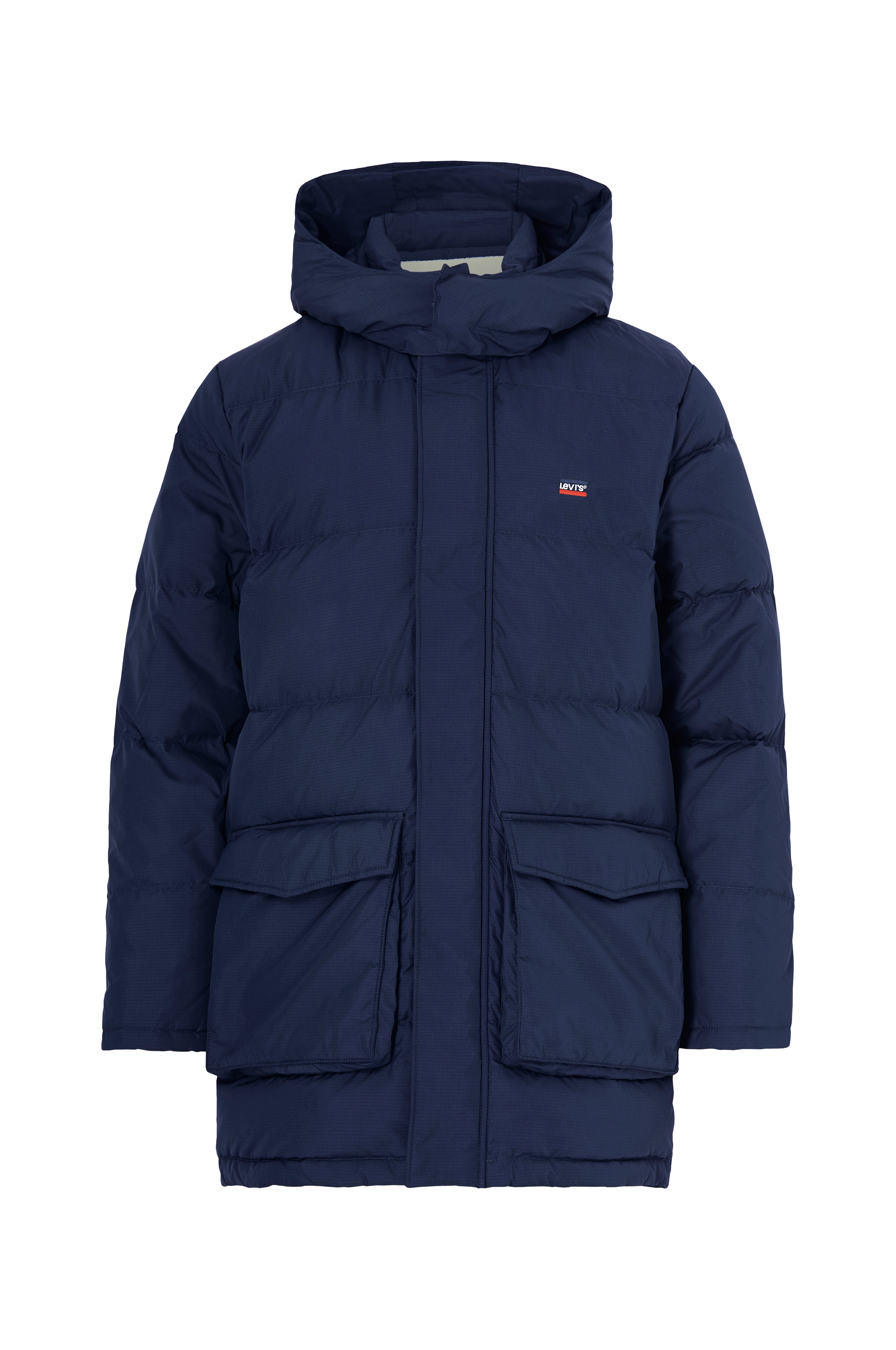 • Quiltad dunjacka • Vattenavvisande yta • Avtagbar huva • Hög krage med fleecefoder • Tvåvägsdragkedja • Vindslå med tryckknappar • Två fickor med tryckknapp • En innerficka med dragkedja • Ribbstickade muddar i ärmsluten • Dragsko nedtill • Längd: 87 cm i storlek M