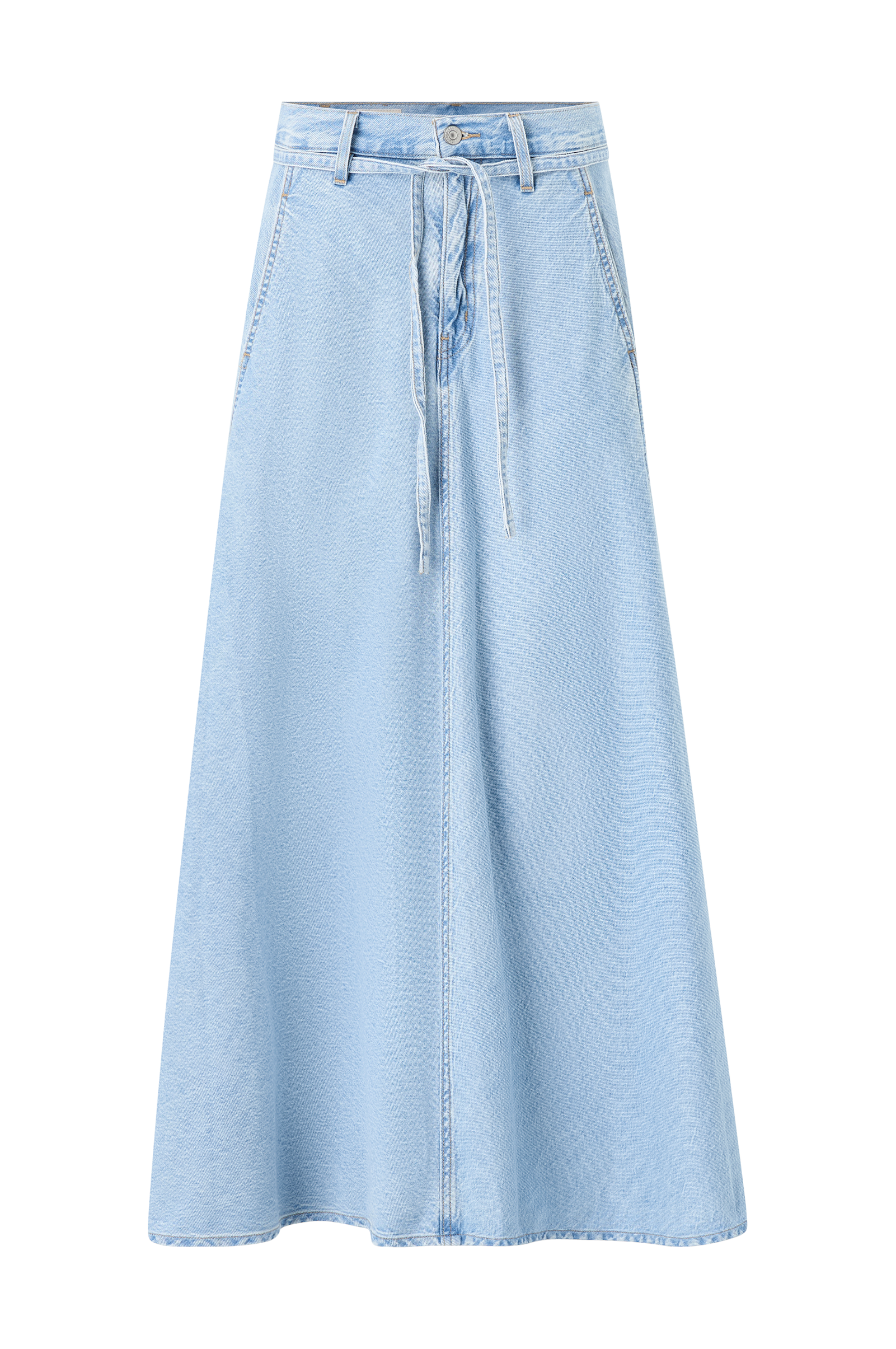 • Utställd, vid kjol i bomullsdenim• Maxilängd• Midja med dragkedje- och knappstängning, bälteshälla och knytband• Fickor i sidorna• Påsytt logomärke i läder bak i midjan• Längd: 102 cm i storlek 27