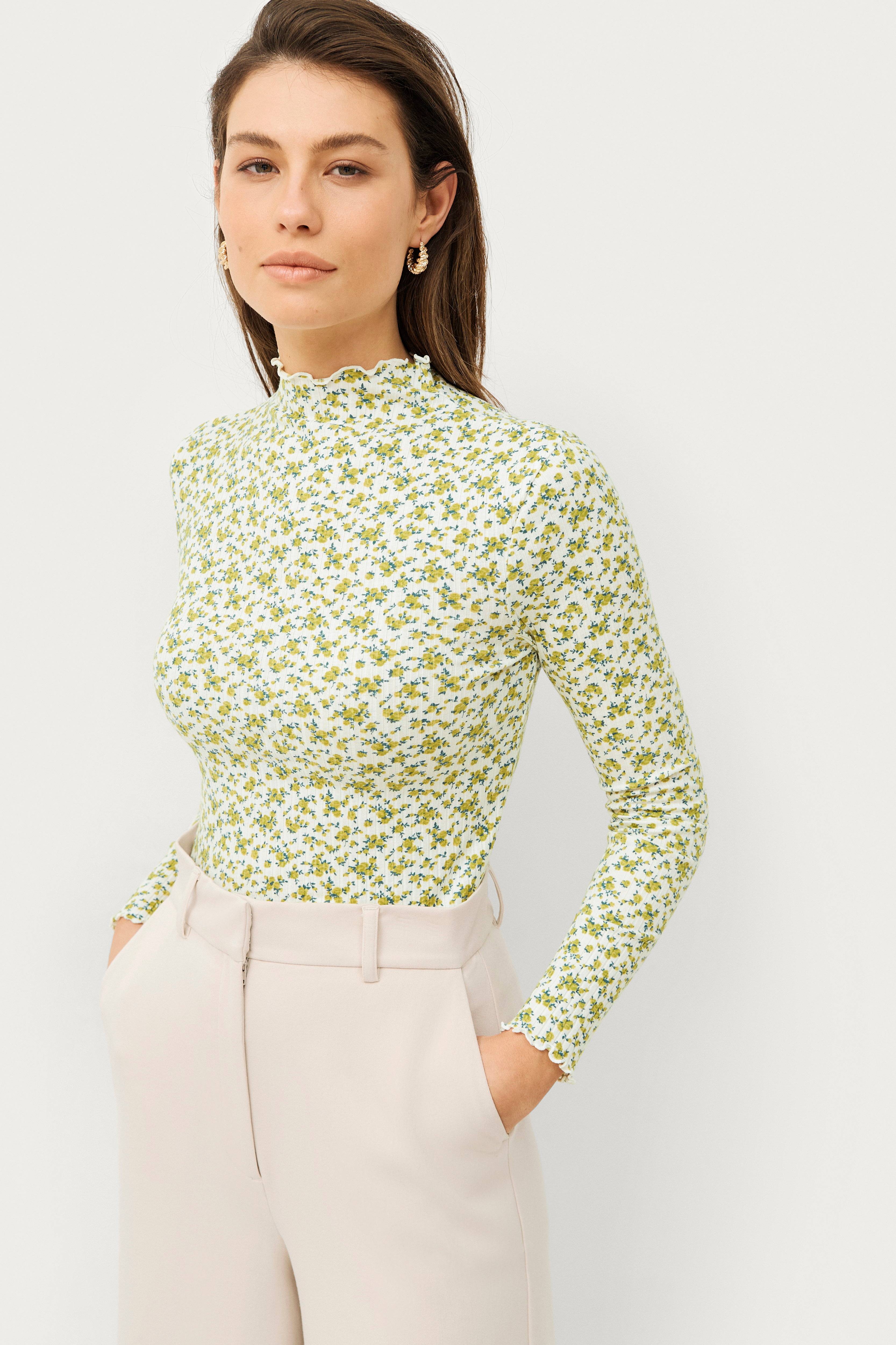 • Smal passform• Ståkrage med vågig kant• Långa ärmar• Gjord av ribbad trikå• Vågig kant i ärmsluten och nedtill