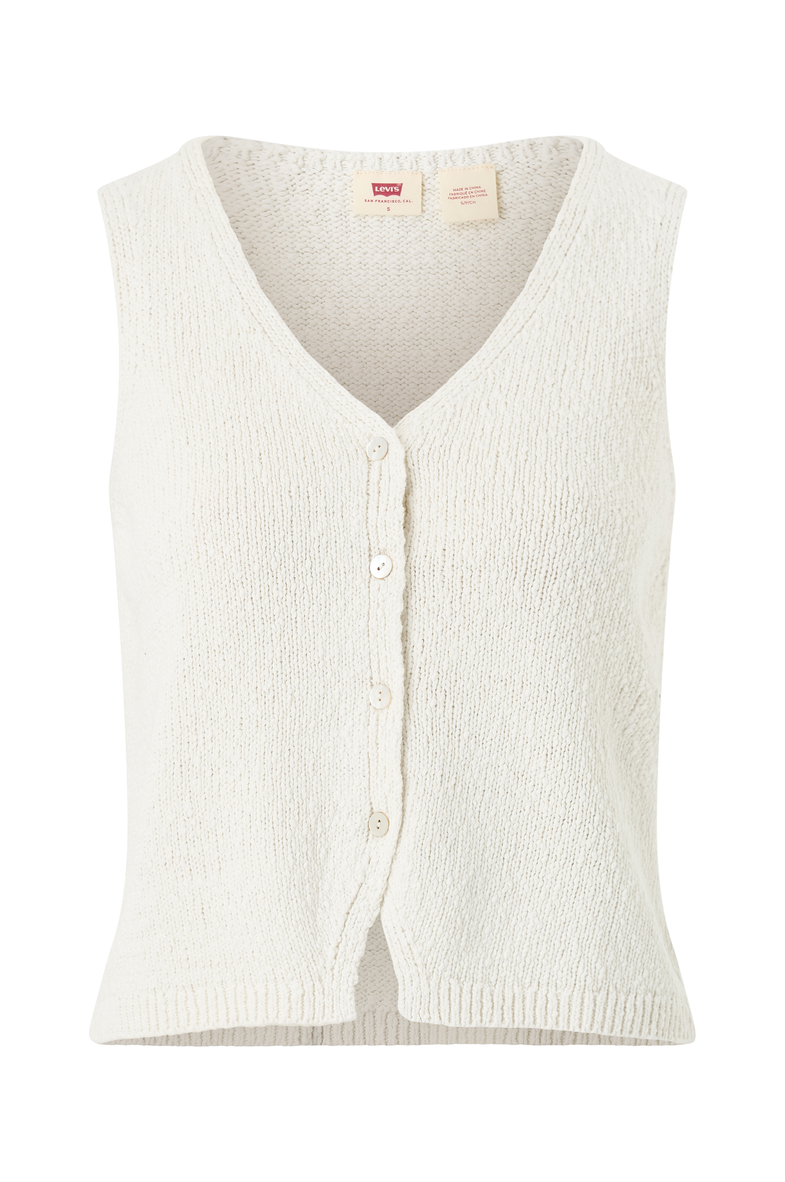 • Finstickad väst• V-ringning• Knappstängning