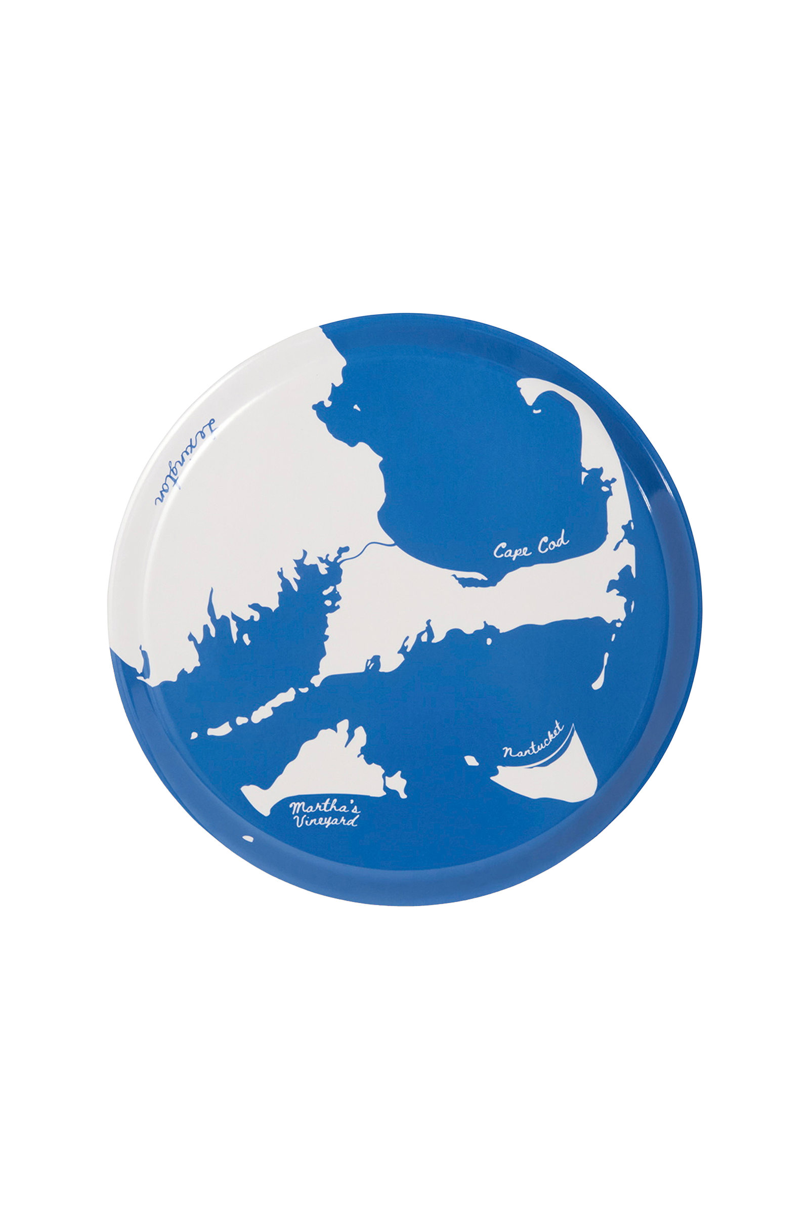 Ge servering och exponering en fräsch kustkänsla med denna UV-skyddade, laminerade runda bricka med vårt konstverk Summer 26 med snäckor över ett blått havsmotiv och en subtil karta över Massachusetts kustlinje. Fanér av björk. Den lätta men robusta brickan är idealisk för frukost på sängen, kvällscocktails eller som dekorativ accent och passar perfekt ihop med resten av kollektionen. Torka av med en fuktig trasa; undvik blötläggning och slipande rengöringsmedel och torka noggrant efter rengöring. 38 cm?