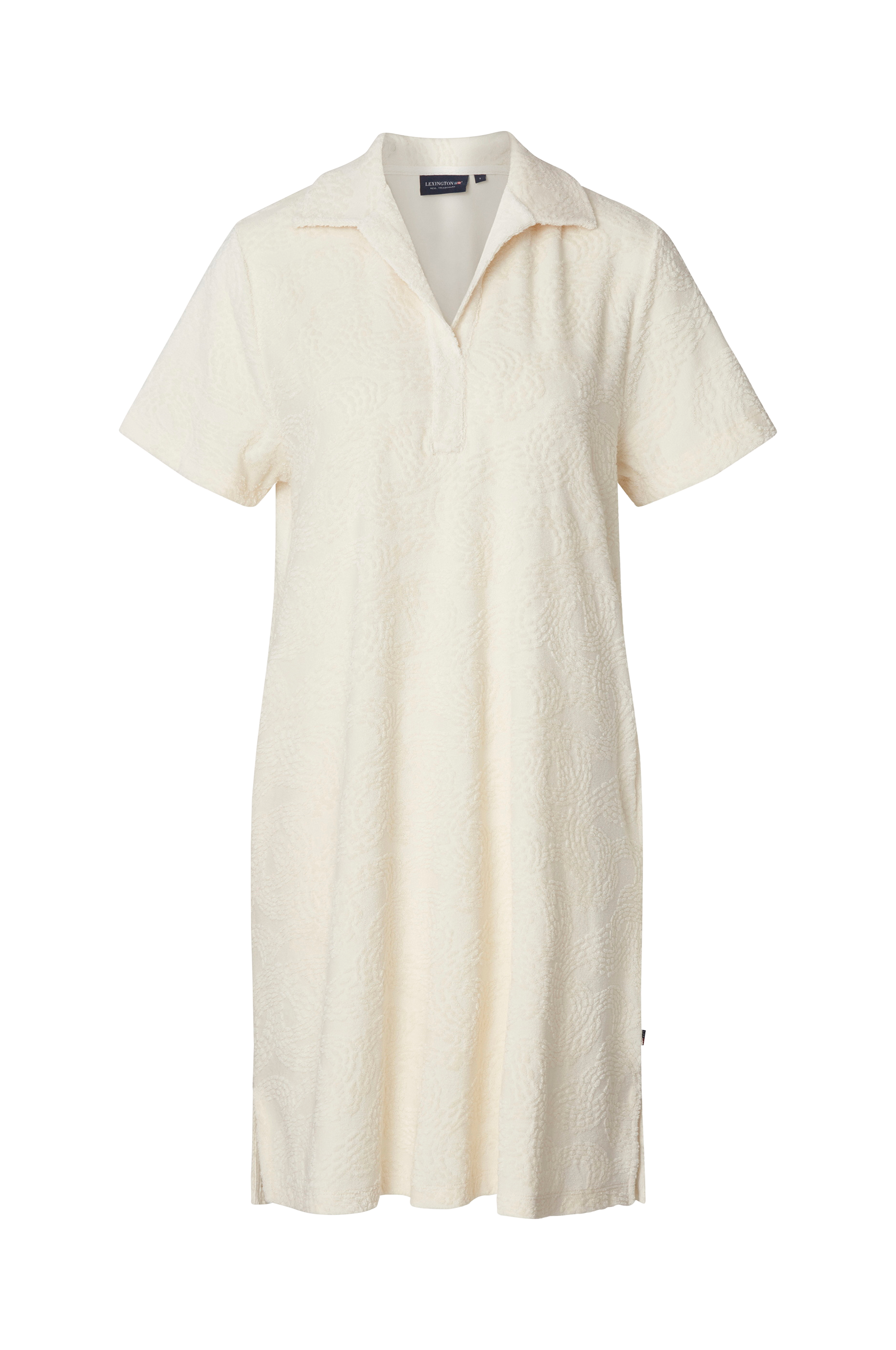 En a-linjeformad klänning i frotté med jacquardmönster. Klänningen utstrålar sommarkänsla och tar dig smidigt från stranden till staden. Bär den över baddräkten när du kommer upp ur vattnet, ha den på dig under en dag med sightseeing eller på eftermiddagens shoppingrunda. Den har en avslappnad passform för optimal komfort. Pikékrage och sidofickor. Längd 94 cm i stl S.
