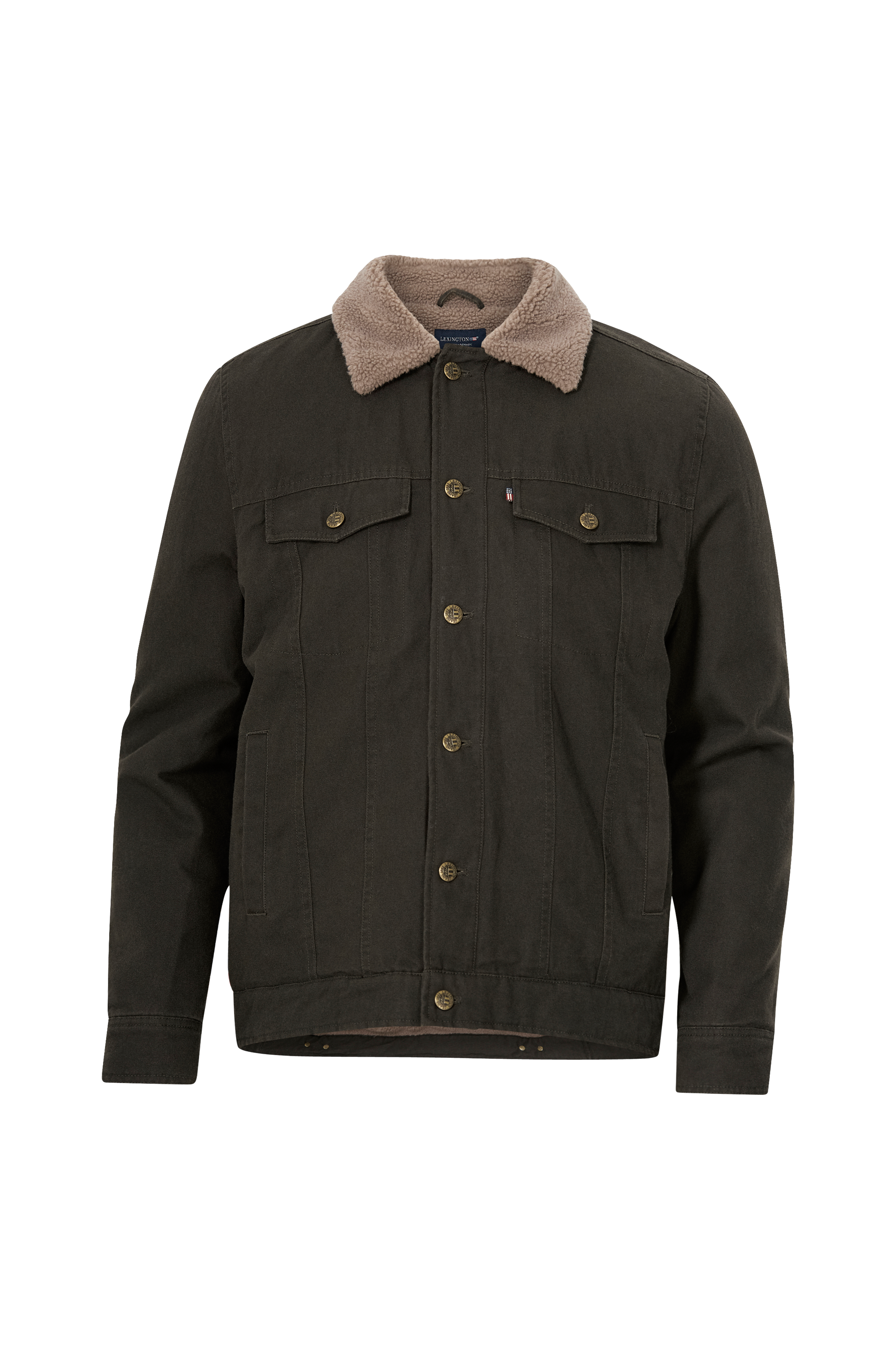 Jacka av tvättad bomullscanvas med teddyfodrad krage och insida samt logotyppräglade metallknappar. Lätt vadderade ärmar med slätt foder. Extra detaljer i form av knappstängning, klaffickor på bröstet samt en inre bröstficka med knappstängning, bröstfickor med lock och märkets flagga, passpoalfickor nedtill och slutligen en upphängningsögla i bomullscanvas.