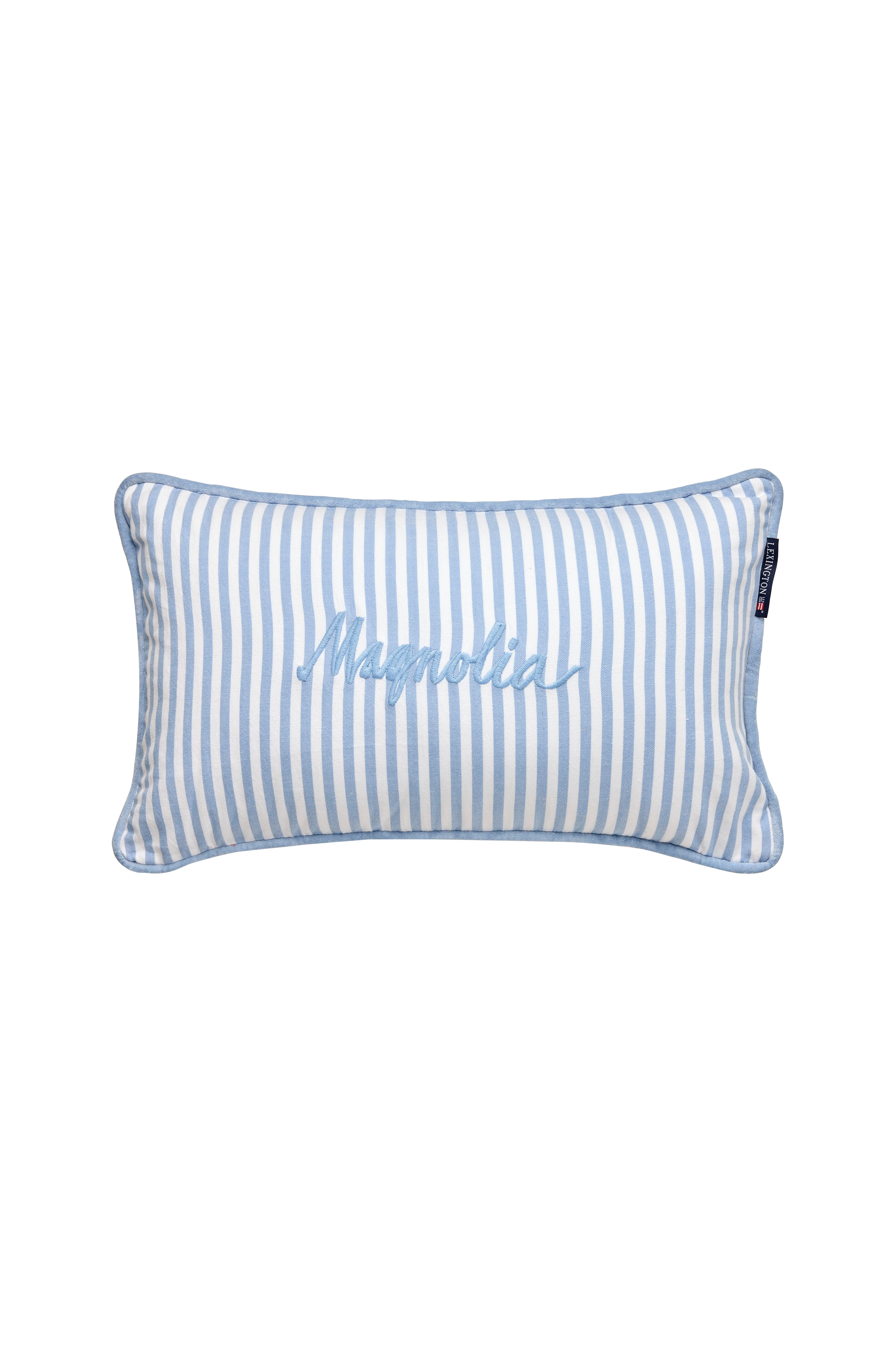 Cotton Oxford Striped Pillow har garnfärgade ränder och ett broderat blomnamn på framsidan, vilket ger ett fräscht och naturligt utseende. Kudden är försedd med en heltäckande sammetspiping för extra textur och har en innerkudde fylld med polyester. Det dolda, färgmatchade blixtlåset i botten garanterar en sömlös finish. Tillverkad i Indien. Storlek: 30x50 cm. Material: 100% bomull: 100% bomull. En perfekt accent för alla rum.