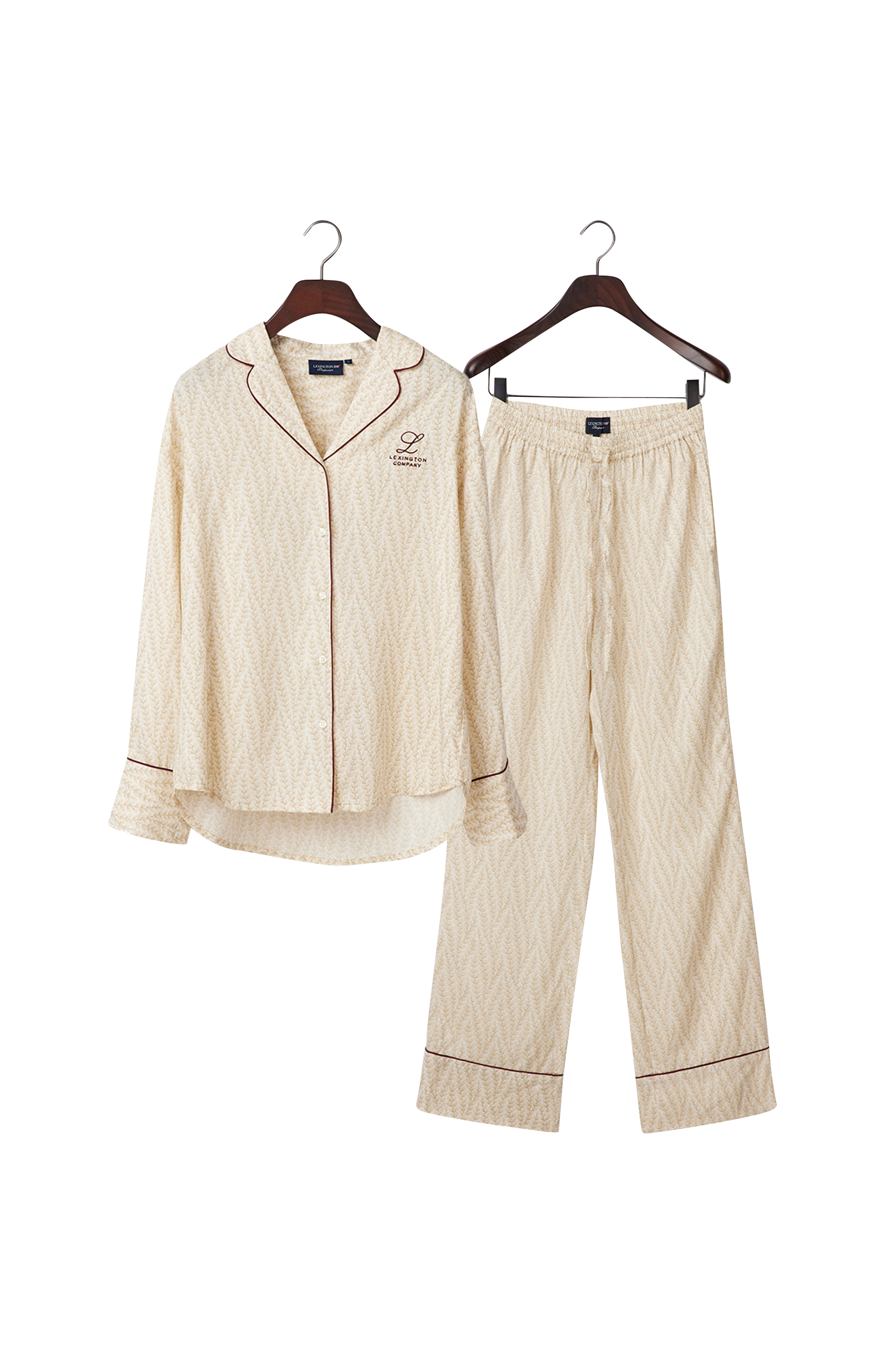Njut av lyxig komfort med vårt pyjamas-set i tryckt lyocell. Detta ljusbeige set är tillverkat av 100 % lyocell och erbjuder exceptionell mjukhet och andningsförmåga för en perfekt natts sömn. Den klassiska passformen har eleganta kontrastdetaljer som accentuerar kragen, knäppningen, manschetterna och fickkanterna, vilket skapar en raffinerad look för avkoppling eller sömn. Överdelen kombinerar funktionalitet med stil, med praktiska knappar fram och en diskret broderad logotyp, medan underdelen ger optimal komfort med elastisk midja, justerbar dragsko och avslappnade, bredare ben. Upplev den perfekta blandningen av sofistikering och komfort med detta premium pyjamaset från Lexington.