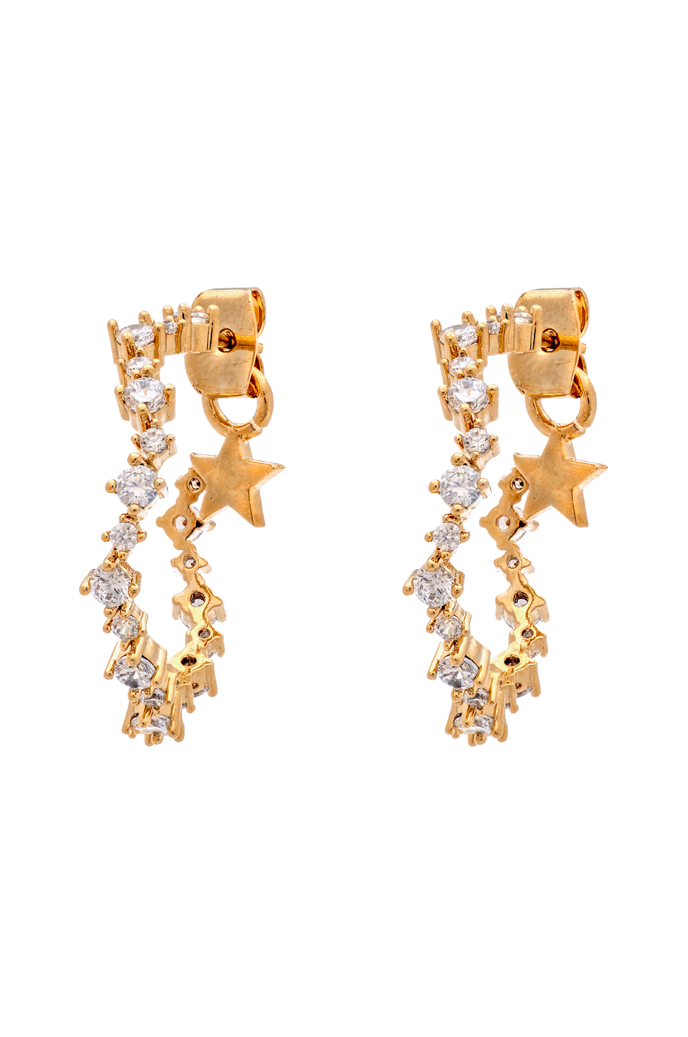 Örhängen Capella Hoops Earrings från Lily and Rose. Stiftmodell av guldpläterad mässing med asymmetriskt formade ringar som har klara Swarovski-kristaller. Ø 2,5 cm.