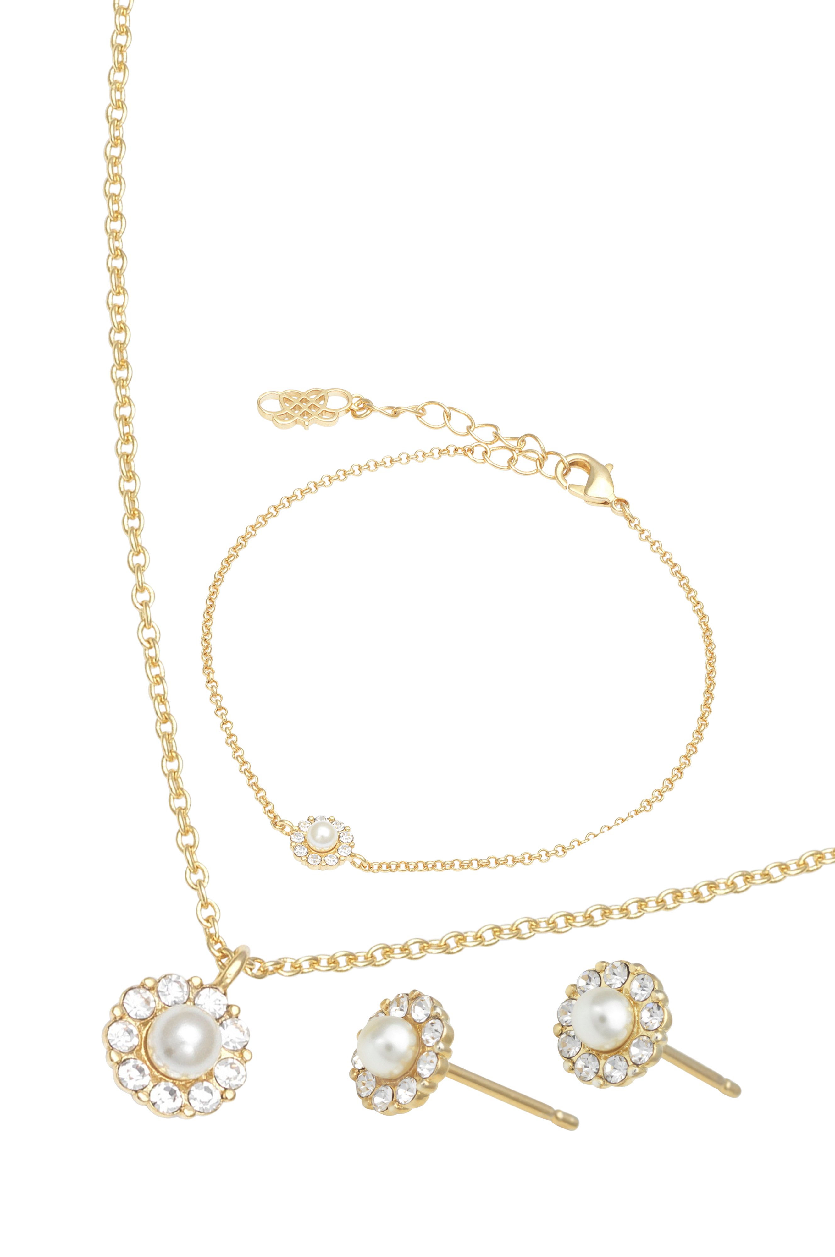• Tre delar• Halsband med hänge• Armband med smycke• Örhängen• Gjort av guldpläterad mässing med swarovskikristaller och pärla• Hänge, smycke, örhängen Ø 7 mm