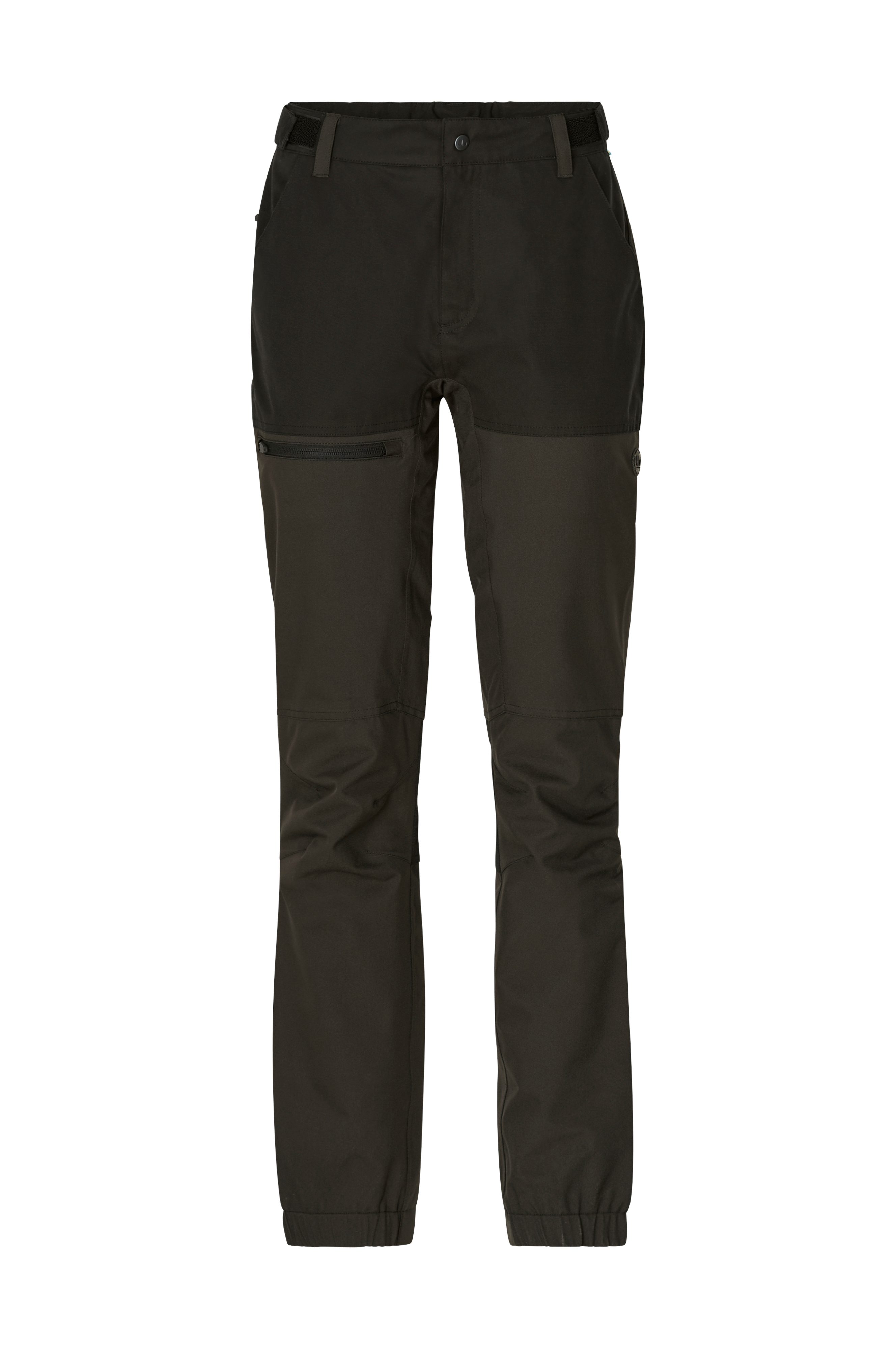 Funktionella, slitstarka friluftsbyxor med stretchigt material på knä och rumpa för ökad smidighet. Helt vattentäta med bra andningsförmåga. Alla sömmar är tejpade. Justerbar midja. Stängning med tryckknapp och gylf med dragkedja. Två fickor fram, en benficka med dragkedja och en bakficka med dragkedja. Justerbara, elastiska benslut. Beninnerlängd ca 79 cm i stl 36.