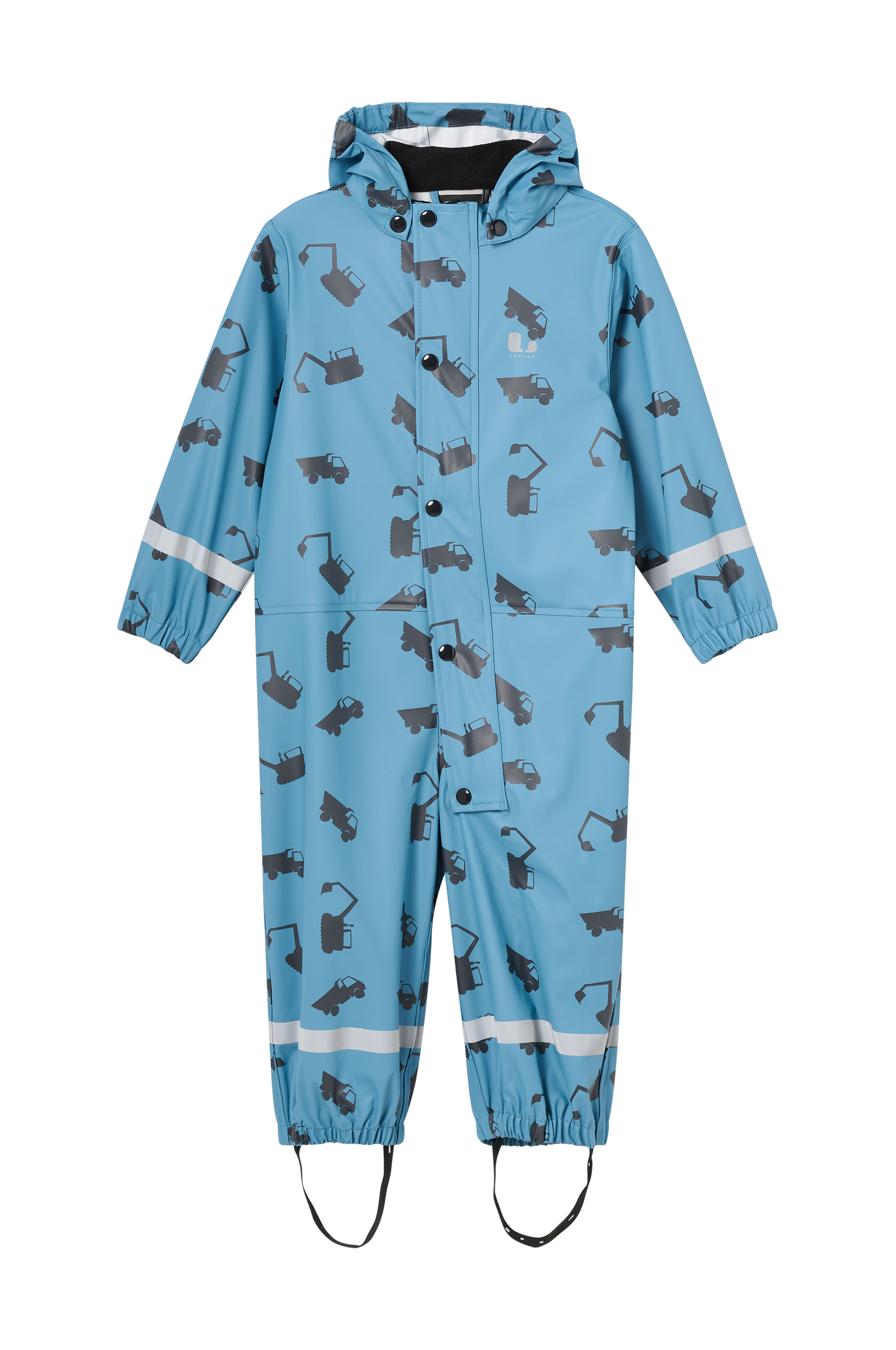 • Vattentät regnoverall i PU • Svetsade, vattentäta sömmar • Ovadderad modell • Avtagbar huva • Hög krage med fleecefoder • Dragkedja • Vindslå över dragkedjan med tryckknappar • Resår i ärmsluten och i bensluten • Elastiska, avtagbara fothällor • Reflexdetaljer • Vattenpelare: 8000 mm