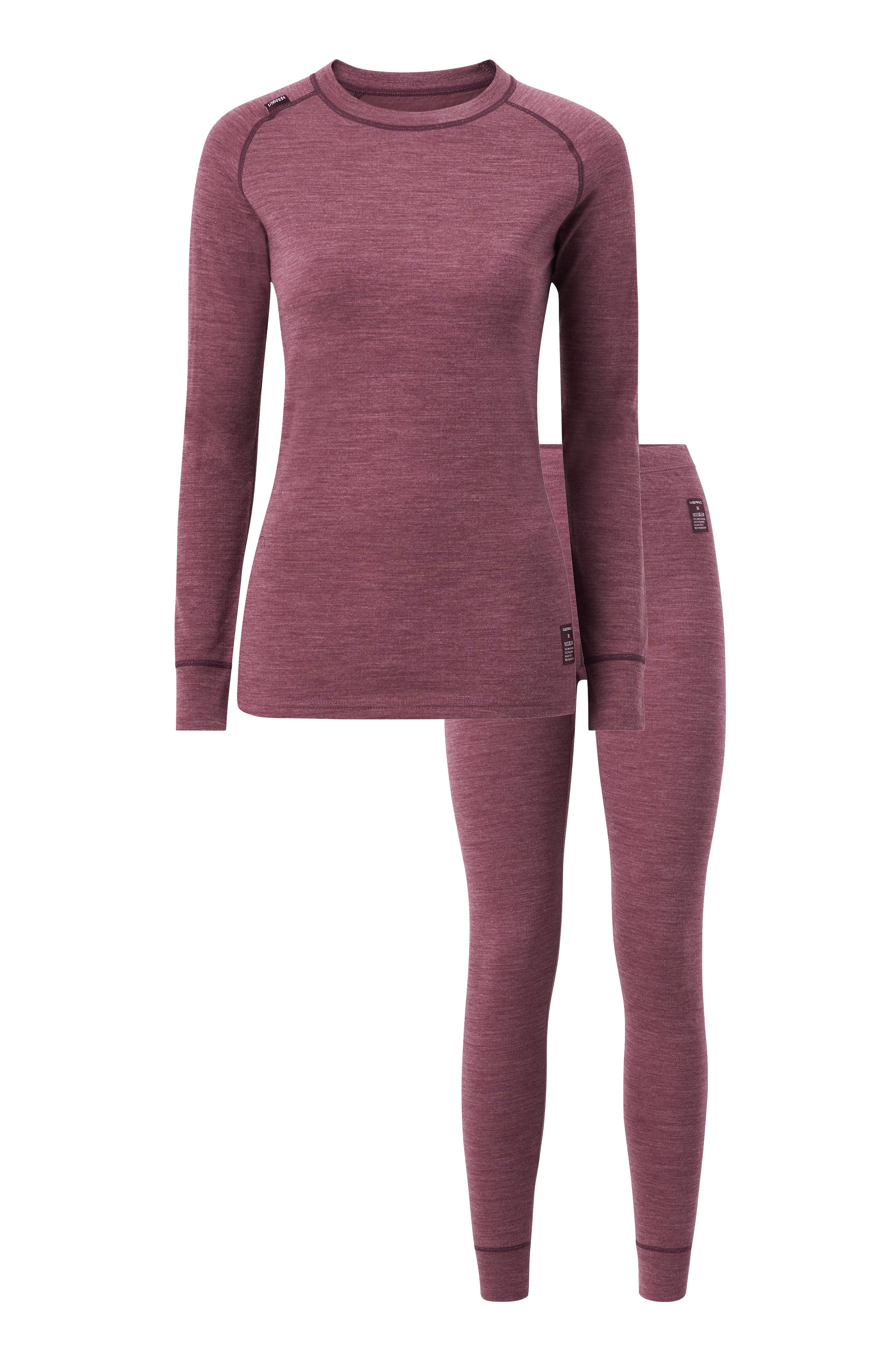 Underställ med tröja och byxa i merinoull med polyester på insidan som gör att det blir extra mjukt och skönt mot kroppen. Tröjan har rund halsringning och muddar i ärmsluten. Byxan har elastisk midja och muddar i bensluten.