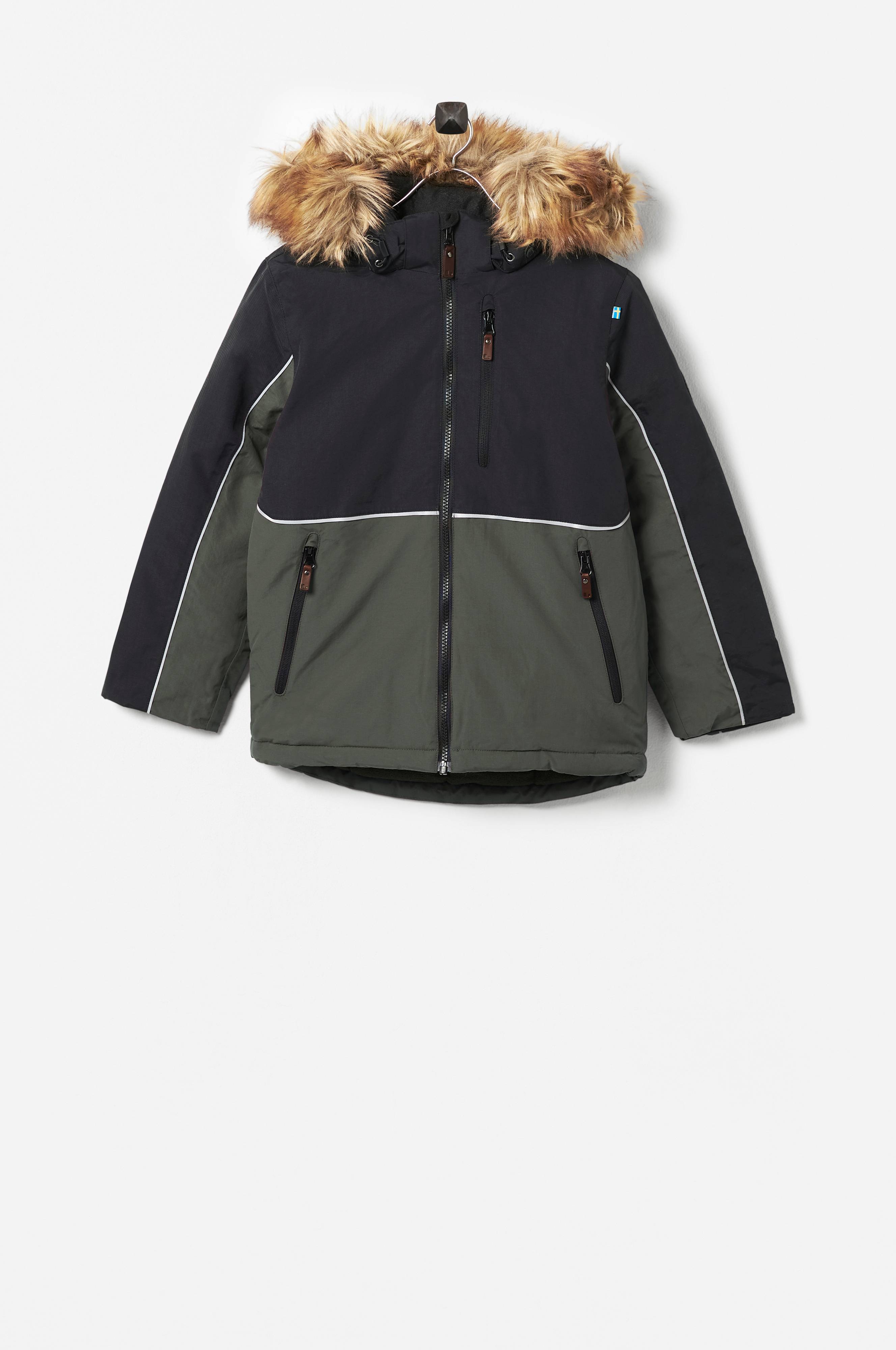 • En varmt vadderad och vattentät vinterjacka • Vattentäthet: 15000 mm • Andningsförmåga: 6000 g/m2/24h • Tejpade sömmar • Fleecefoder i ryggen • Justerbar och avtagbar huva med avtagbar fuskpälskant • Tre fickor med dragkedja • Justerbara ärmslut med elastiska trikåmuddar • Dragsko med stoppers i nederkanten • Reflexdetaljer runt om • Utrustad med "grow cuff" som gör att du kan förlänga ärmarna genom att sprätta upp en söm • Produkten är impregnerad med Rudolf Bionic Finish Eco, en vattenavvisande behandling som är fri från tillsatta perfluorerade ämnen (PFC). Du kan behöva återaktivera impregneringen om vattnet på ytan slutar pärla sig. Detta gör du genom att tillsätta värme på låg temperatur genom t.ex. strykning eller torktumling. Vid behov kan även impregneringspreparat behövas.