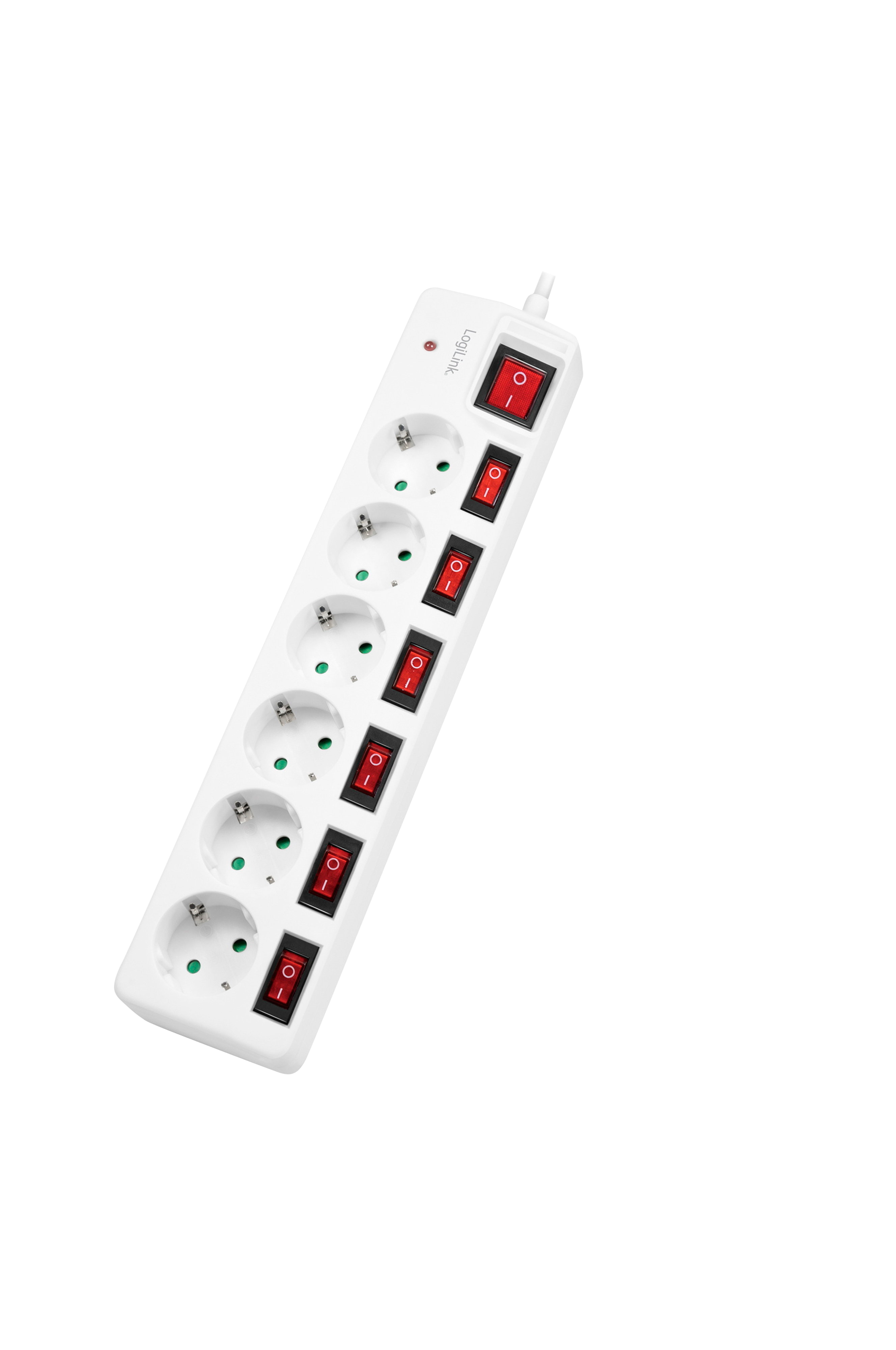 6-vägs grenuttag med plats för sex elektriska enheter samtidigt. Strömmen för varje uttag kan brytas individuellt, eftersom varje uttag har sin egen upplysta på/av-brytare.