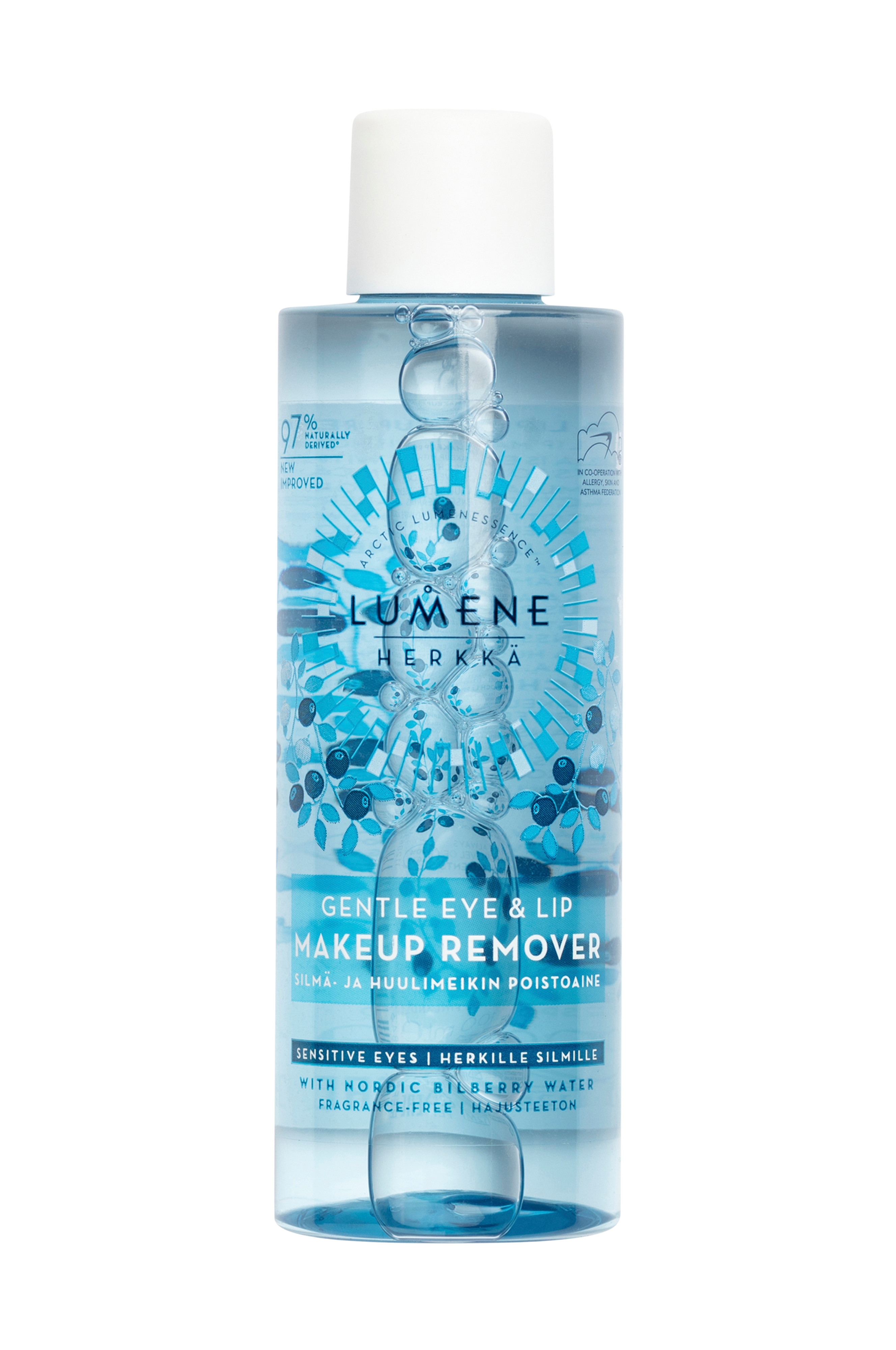 En extra skonsam makeup-remover berikad med blåbärsvatten och arktiskt källvatten som enkelt avlägsnar smink från ögon och läppar och gör att huden genast känns lugn och behaglig. Formulan är fri från parfym och olja och har utvecklats i samarbete med Allergi-, Hud- och Astmaförbundet i Finland. Produkten har testats under översyn av ögonläkare och passar för dig som har känsliga ögon eller använder kontaktlinser. 100 % vegansk.