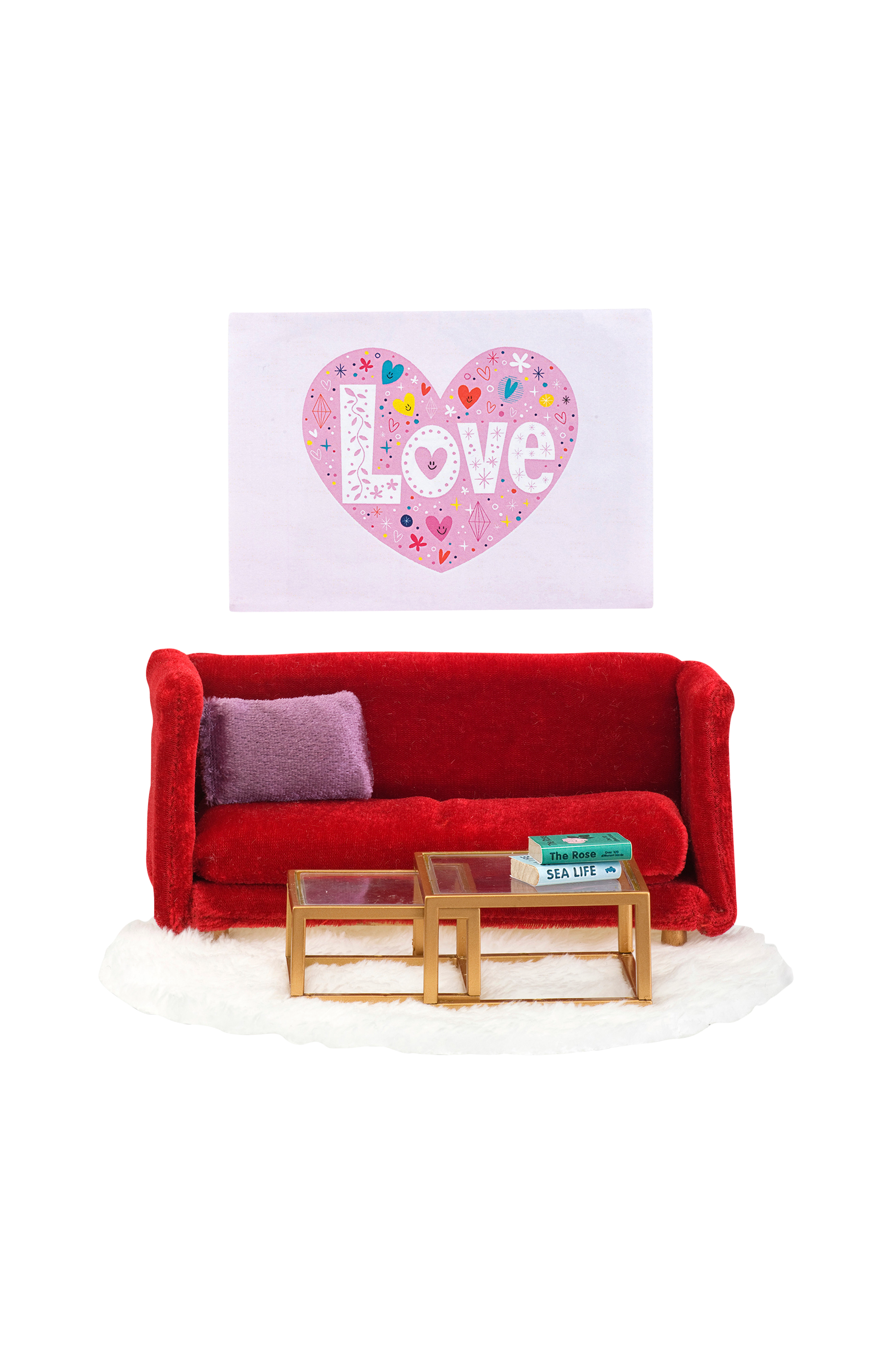 Ge vardagsrummet eller salongen ett lyft med hjälp av detta fina Lundby set! Trendigt och elegant med en mysig soffa i röd sammet, ett guldfärgat satsbord och en härlig matta. Pricken över i blir den fina tavlan till väggen och två böcker till soffbordet.