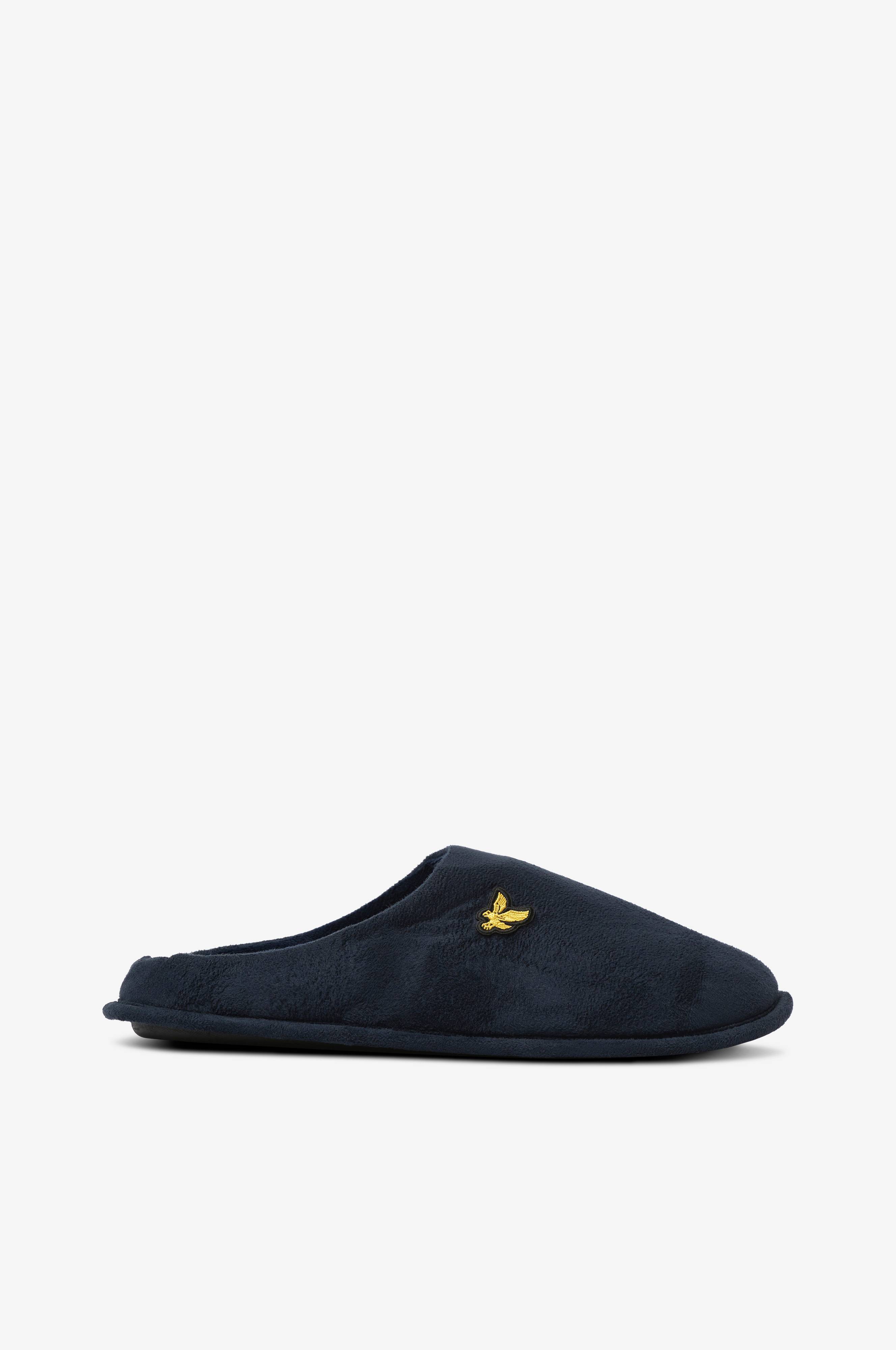Innetofflor i mjuk, borstad textil. Mjukstoppad fotbädd. Broderad logga på ovansidan.
