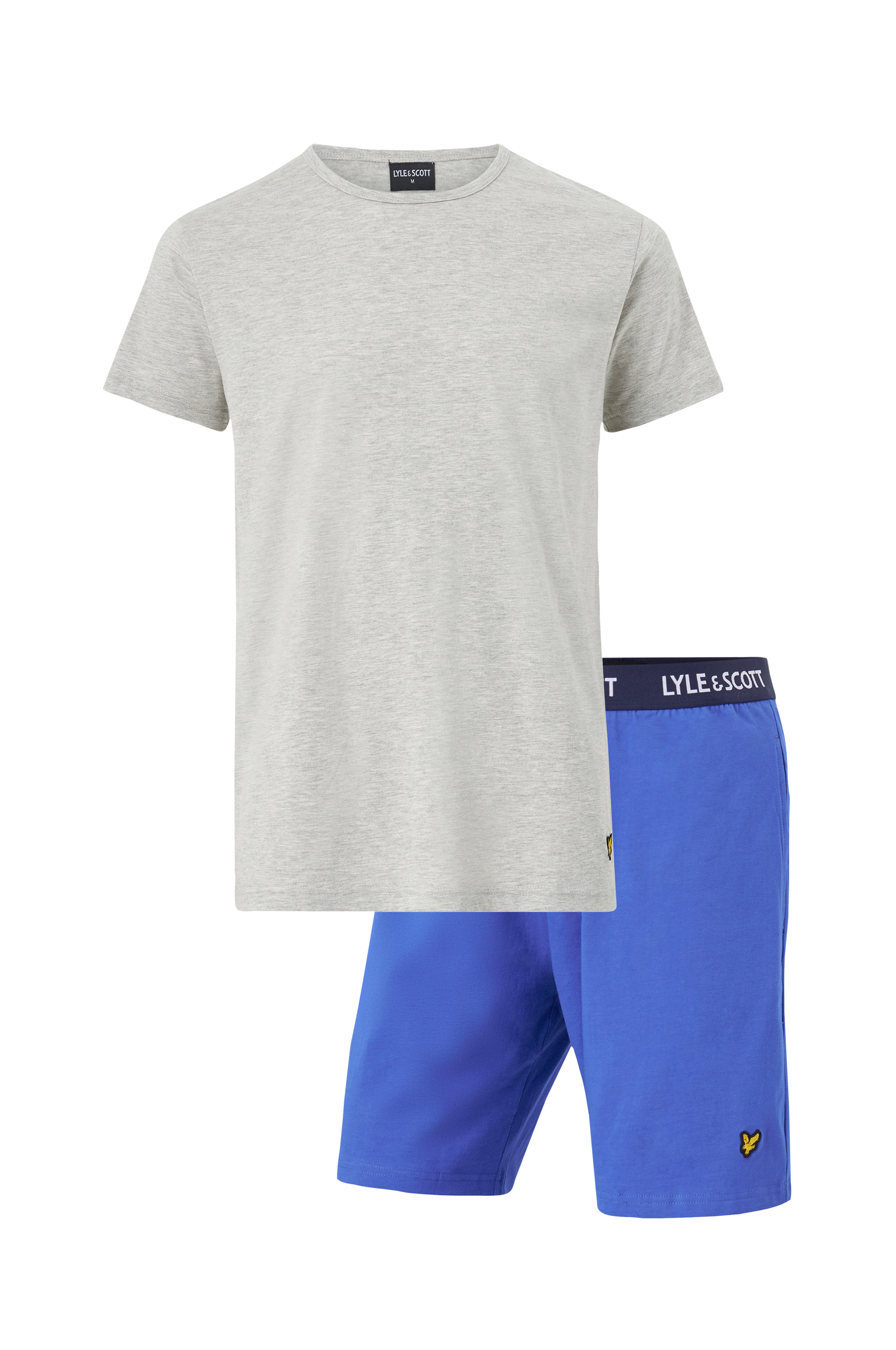 Pyjamasset med t-shirt och shorts i mjuk, stretchig bomullstrikå. T-shirten har rund halsringning och shortsen har resårmidja.