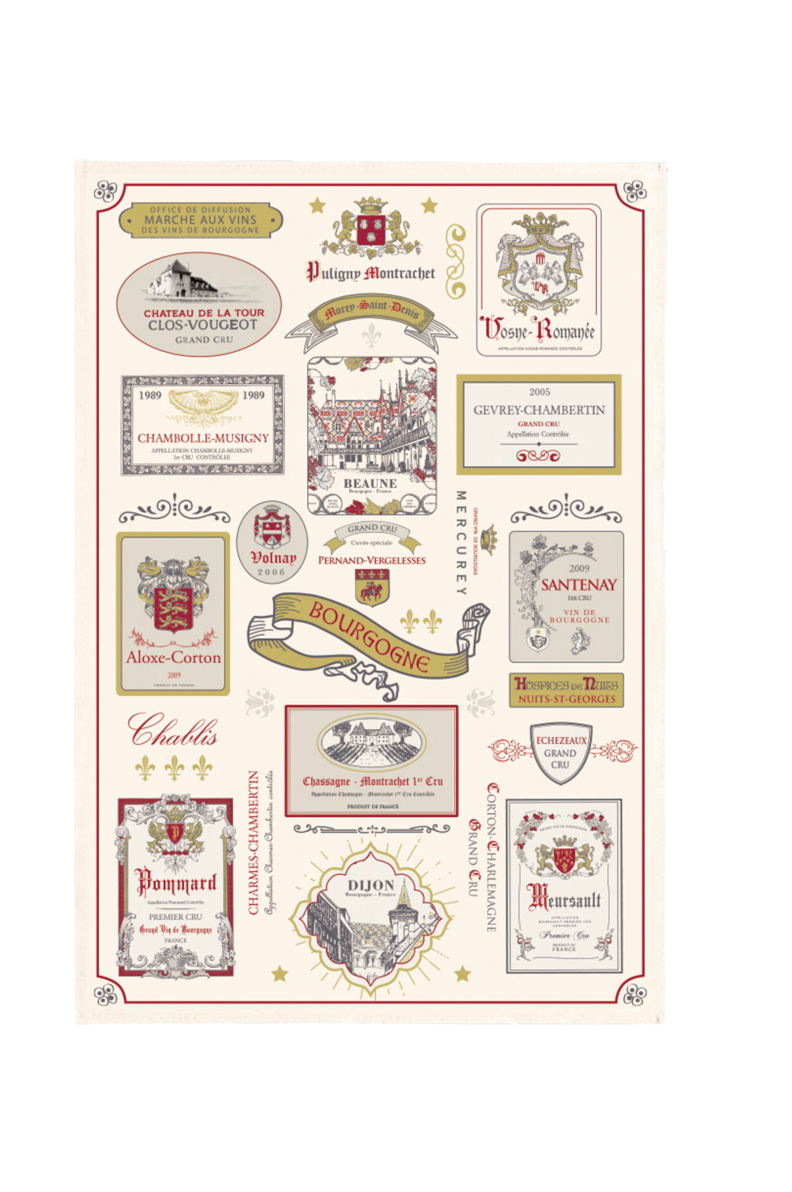 En kökshandduk som lyfter fram Bourgogne-regionen! Kökshanduken multi-étiquettes bourgogne från varumärket winkler kommer att vara mycket användbar i ditt kök. Den är tillverkad av 100% bomull och kommer att ta väl hand om din disk. Denna kökshandduk har flera etiketter som chambolle-musigny och gevrey-chambertin.