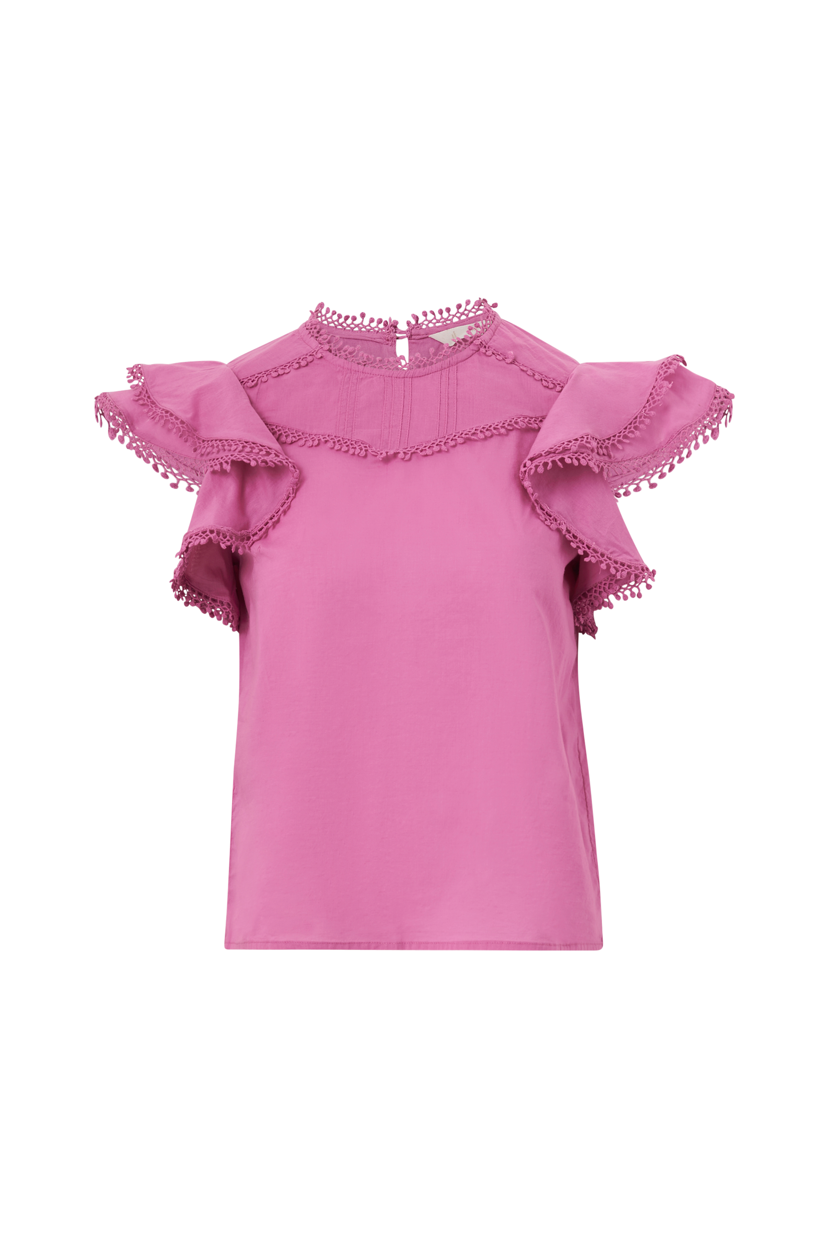• Korta volangärmar• Sprund med knapp i nacken• Dekorativ spetskant på ärmarna, i halsen och upptill fram