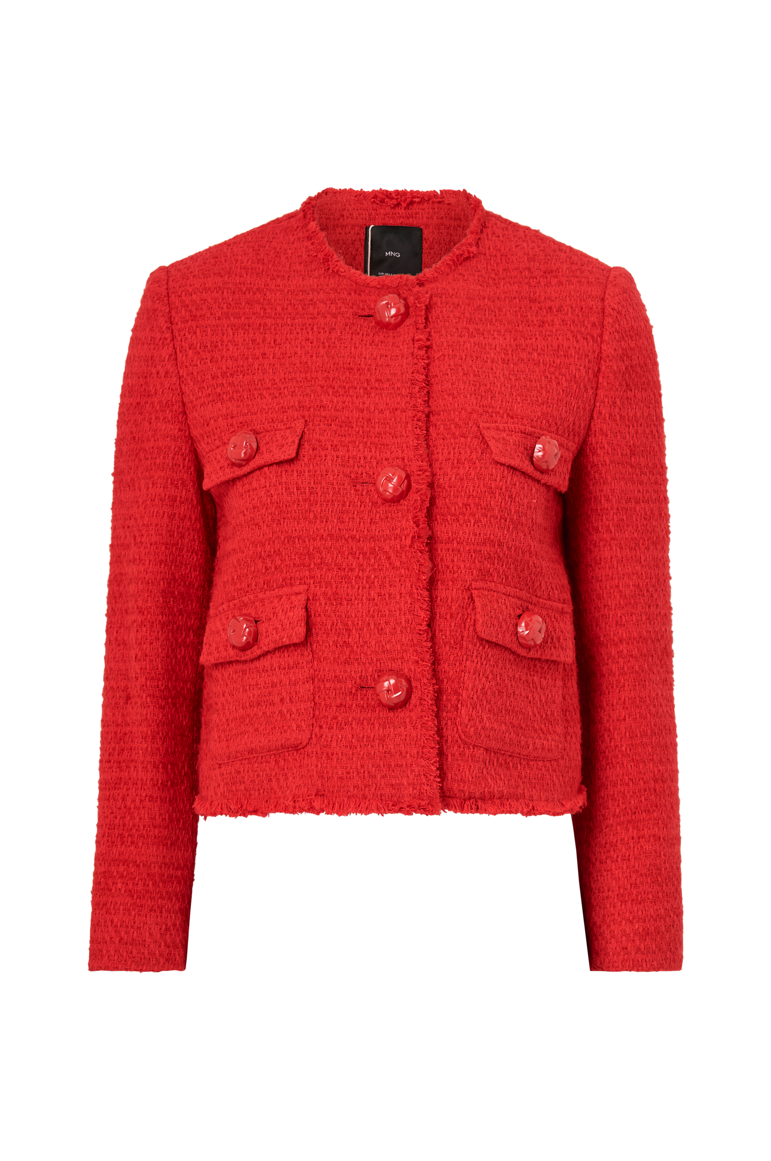• Kort modell • Strukturmönstrad kvalitet med fransade kanter • Stora, dekorativa knappar • Två fickor • Två fuskfickor • Axelvaddar • Fodrad • Längd: 49 cm i storlek S • Produkten innehåller återvunnet material som har tagits tillvara för att minska mängden avfall, samtidigt som nya resurser inte har förbrukats.