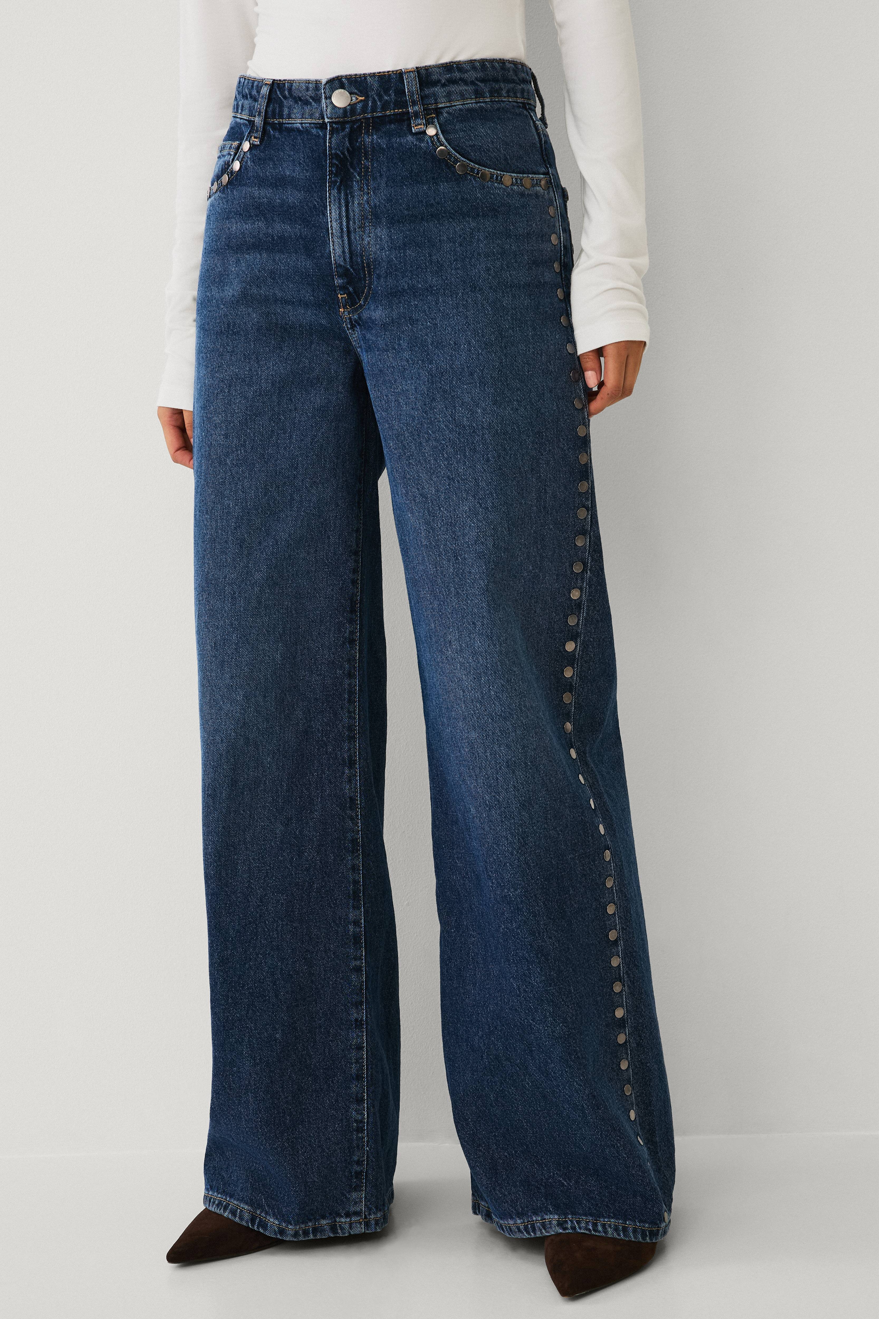 • Jeans med vida ben• Runda nitar längs benen och på fickorna• Dragkedjegylf• Femficksmodell• Beninnerlängd: 80 cm i storlek 36