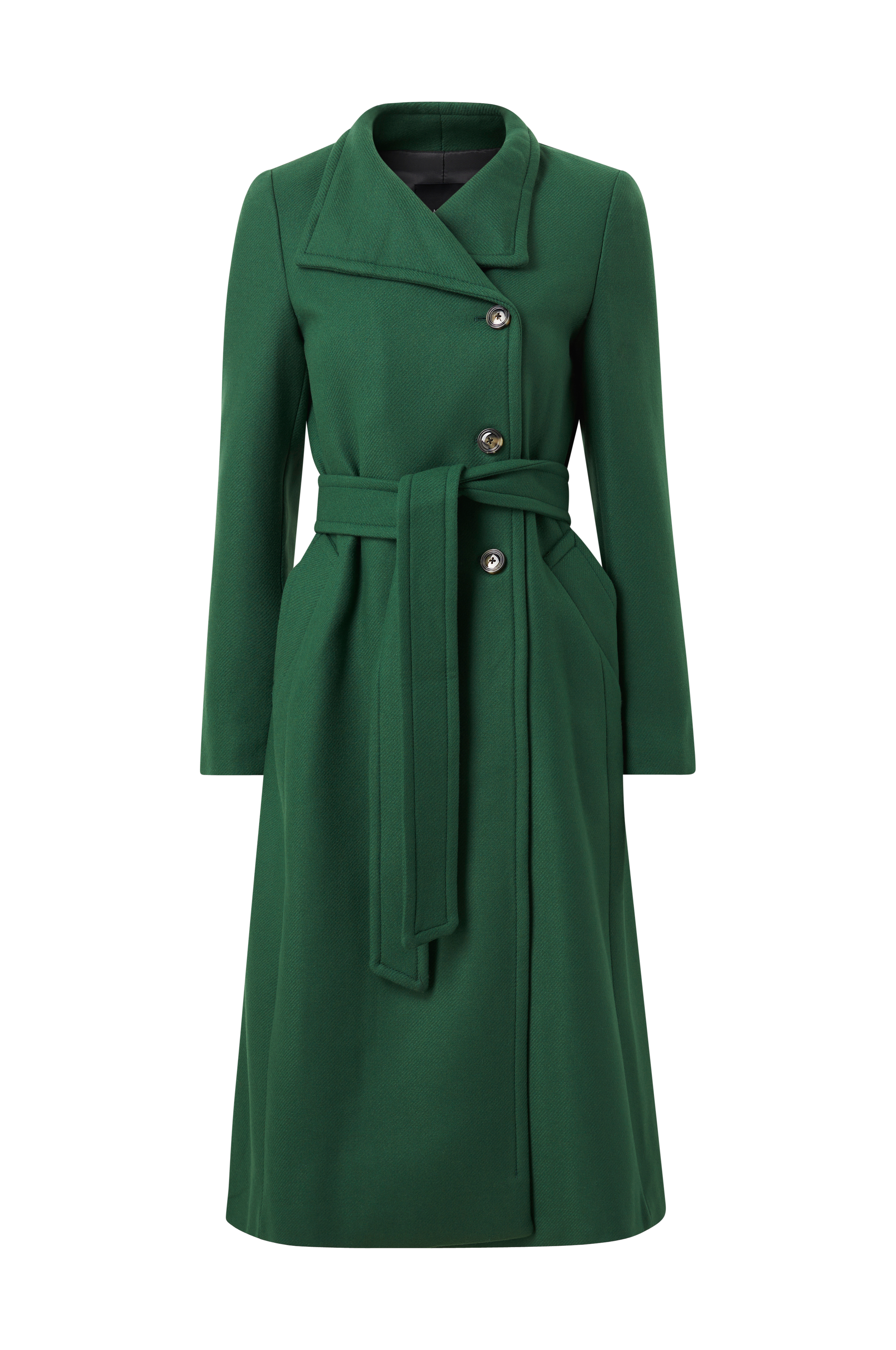 • Lång modell med hög krage• Knappar fram• Hällor med knytskärp i midjan• Infällda fickor• Högt sprund nedtill bak• Tunna axelvaddar• Fodrad• Längd: 114 cm i storlek S