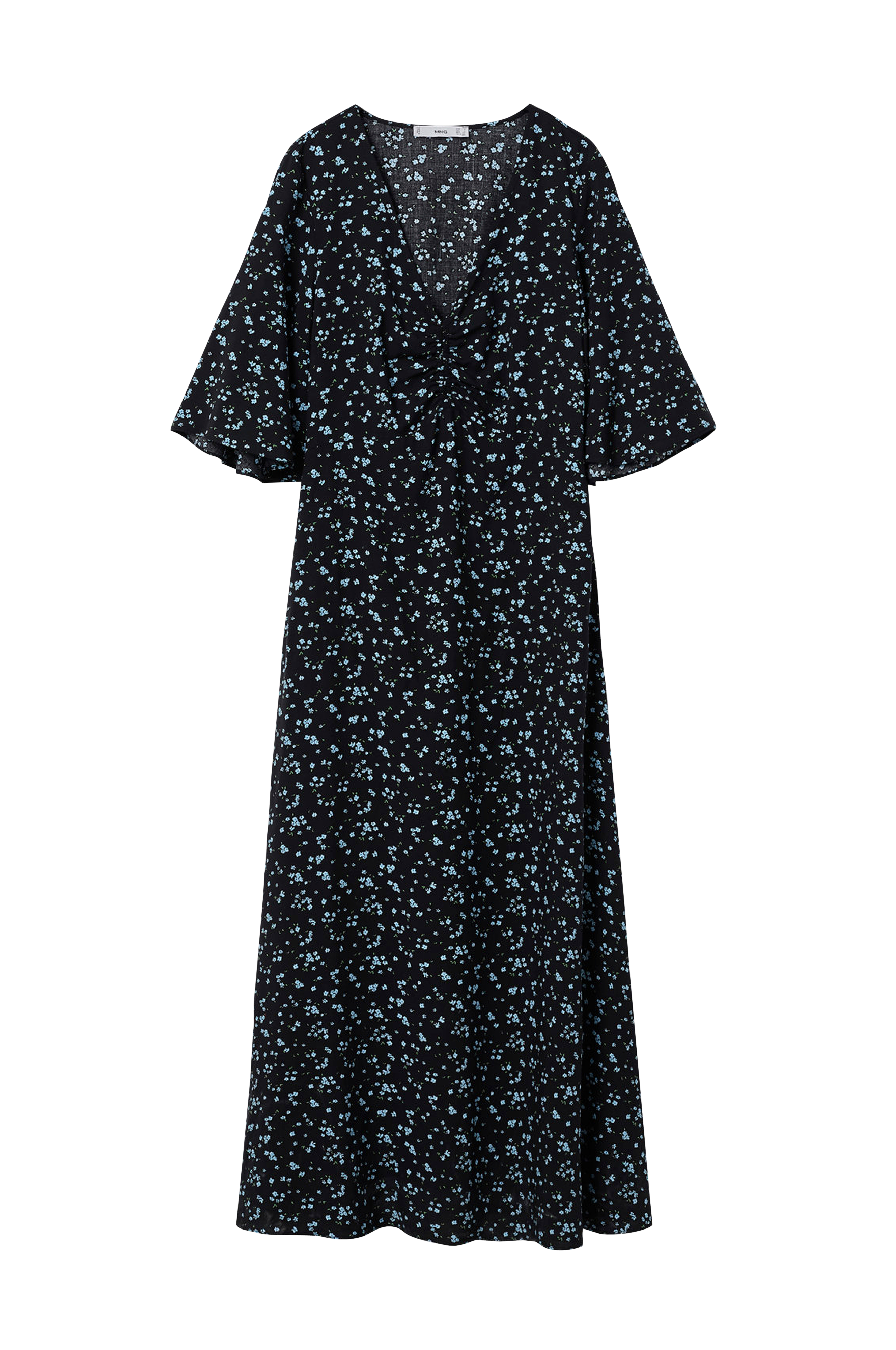 Klänning i vävd viskoskvalitet med tryckt mönster. V-ringad hals med rynkade detaljer fram under halsringningen. Korta fjärilsärmar och dragkedja i den ena sidan. Längd ca 128 cm i stl S.