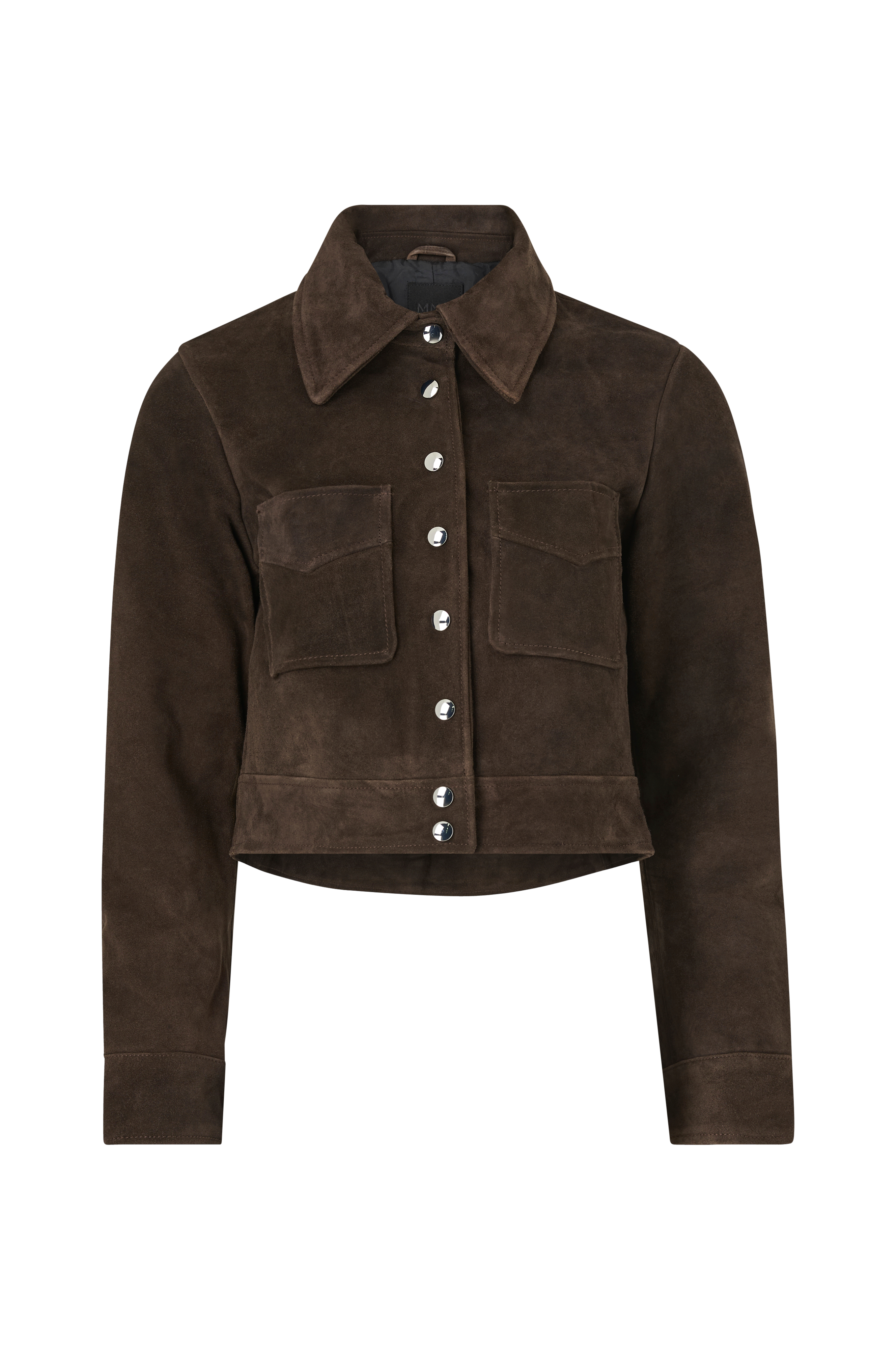 • Jacka i mjuk mocka med ett vävt foder• Croppad längd• Krage• Silverfärgade tryckknappar• Två fickor• Två tryckknappar i ärmsluten• Längd: 48 cm i storlek 36