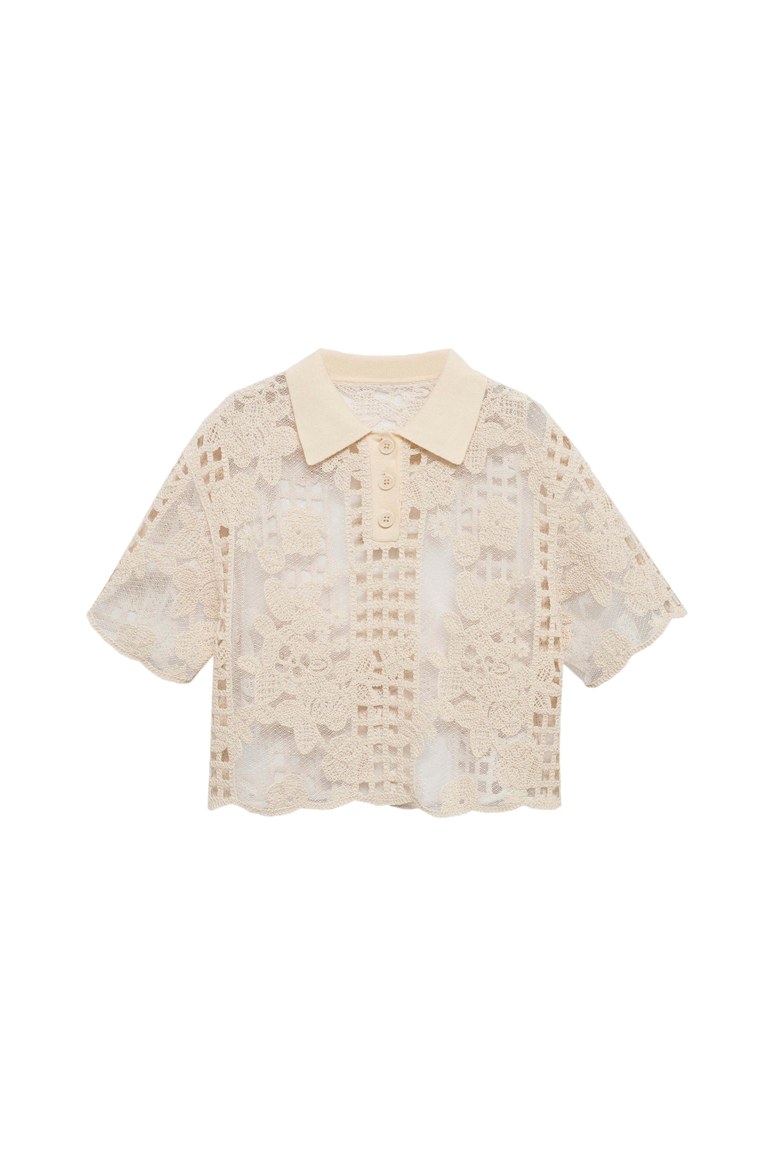 • Transparent blus i spets• Croppad, vid modell• Ribbad krage• Knappar upptill fram