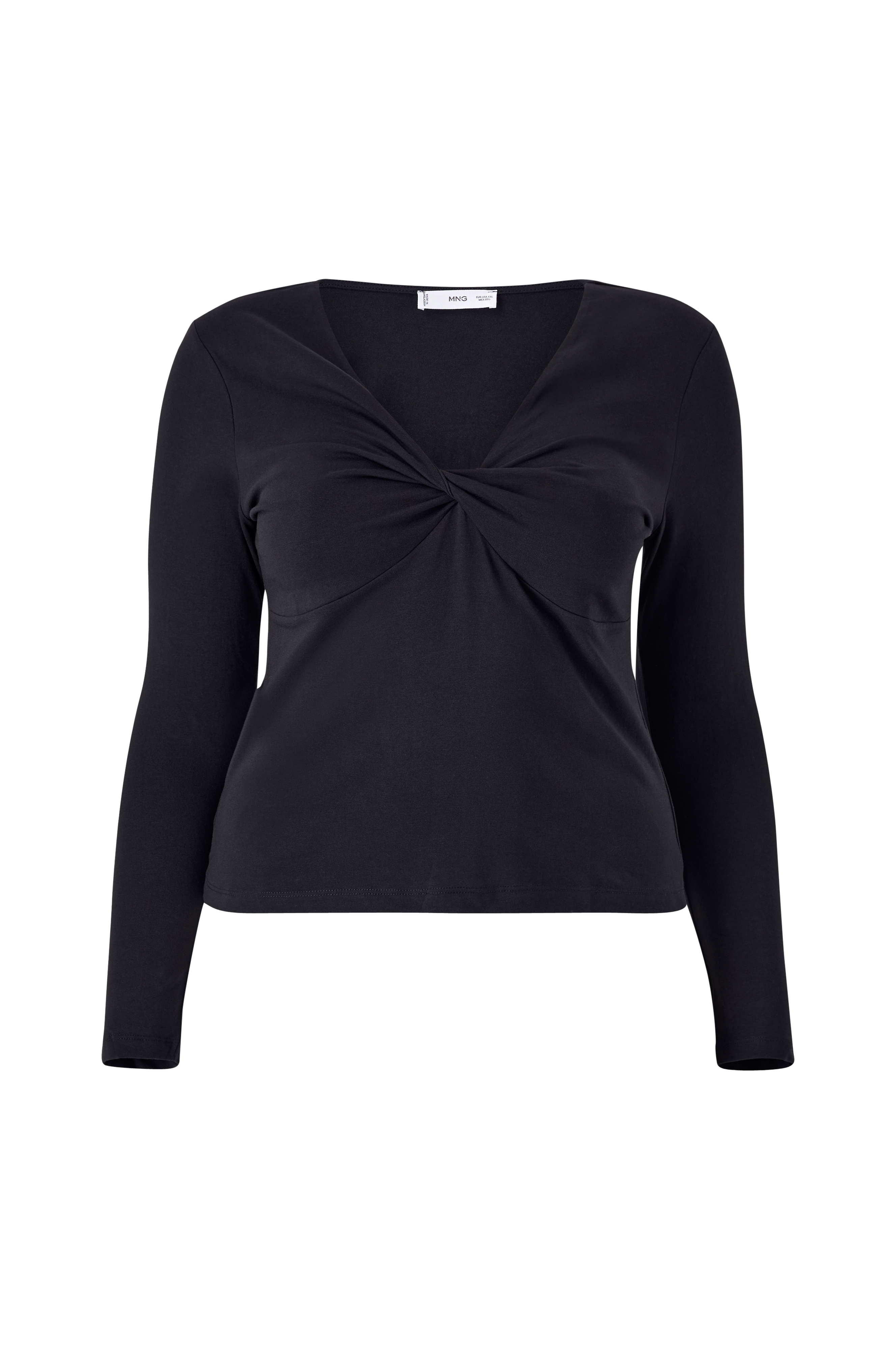 • Topp i bomullstrikå• Långa ärmar• V-ringning med knutdrapering fram