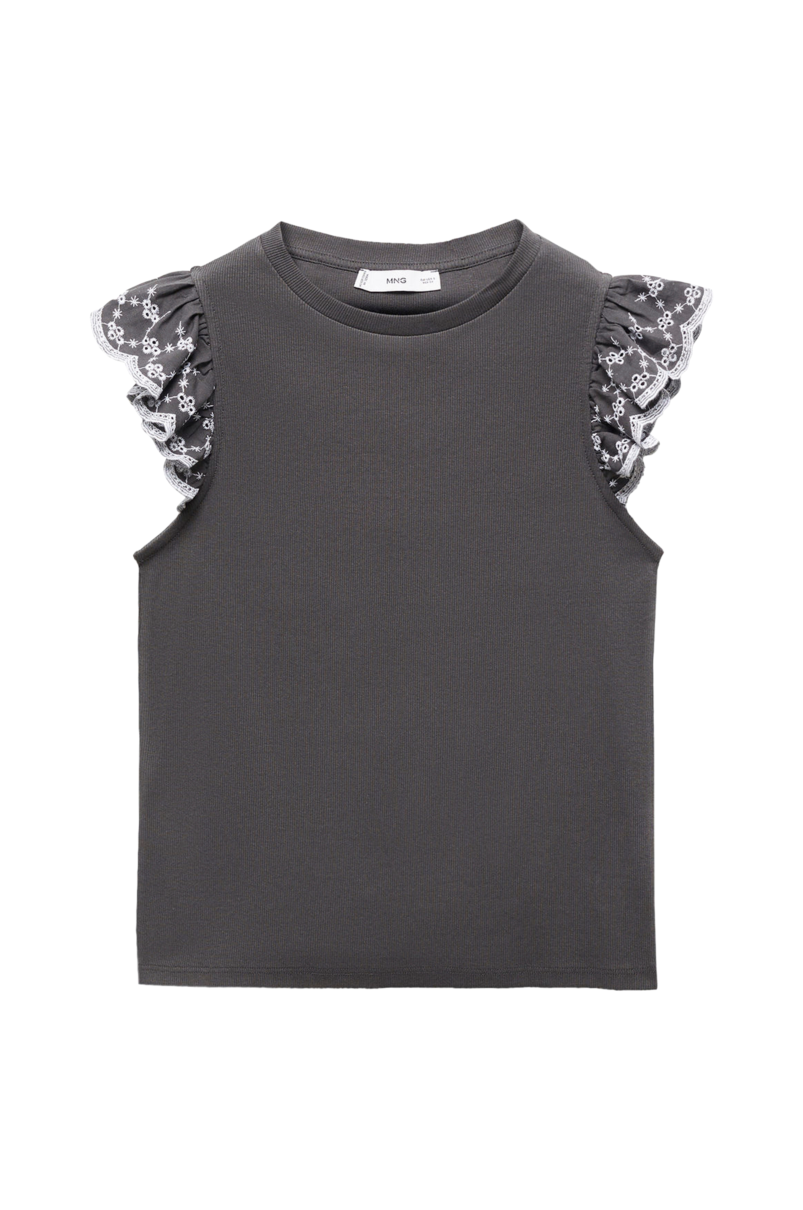• Ribbstickad modell• Korta, vävda volangärmar• Rund hals